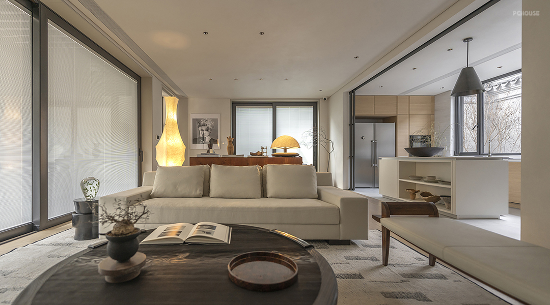 老木头、陶土、石头,粗粝与细腻相生碰撞,通过材质与色彩的变化,达成场域的转换,将生活的细微美好悉数勾勒。从幽玄庭园,倏地来到明朗客厅。入室,开放式格局融纳客厅、餐厨,可以自如穿梭于不同场景之间。