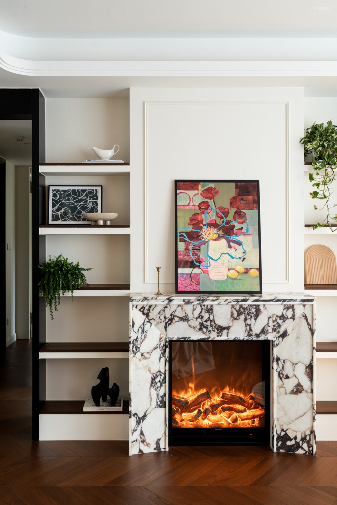 李小姐一家经常去各地走走看看,带回来的纪念品就放在开放的展示架上,积攒的回忆碎片也成为家的装饰品。