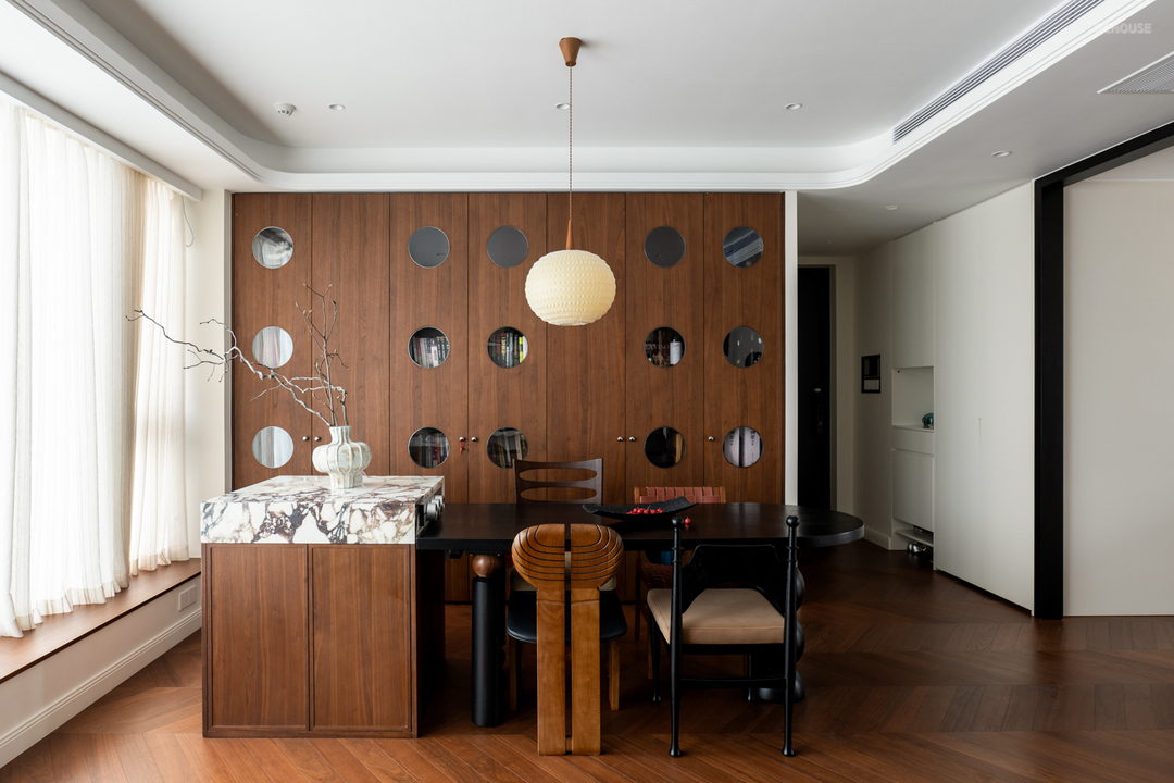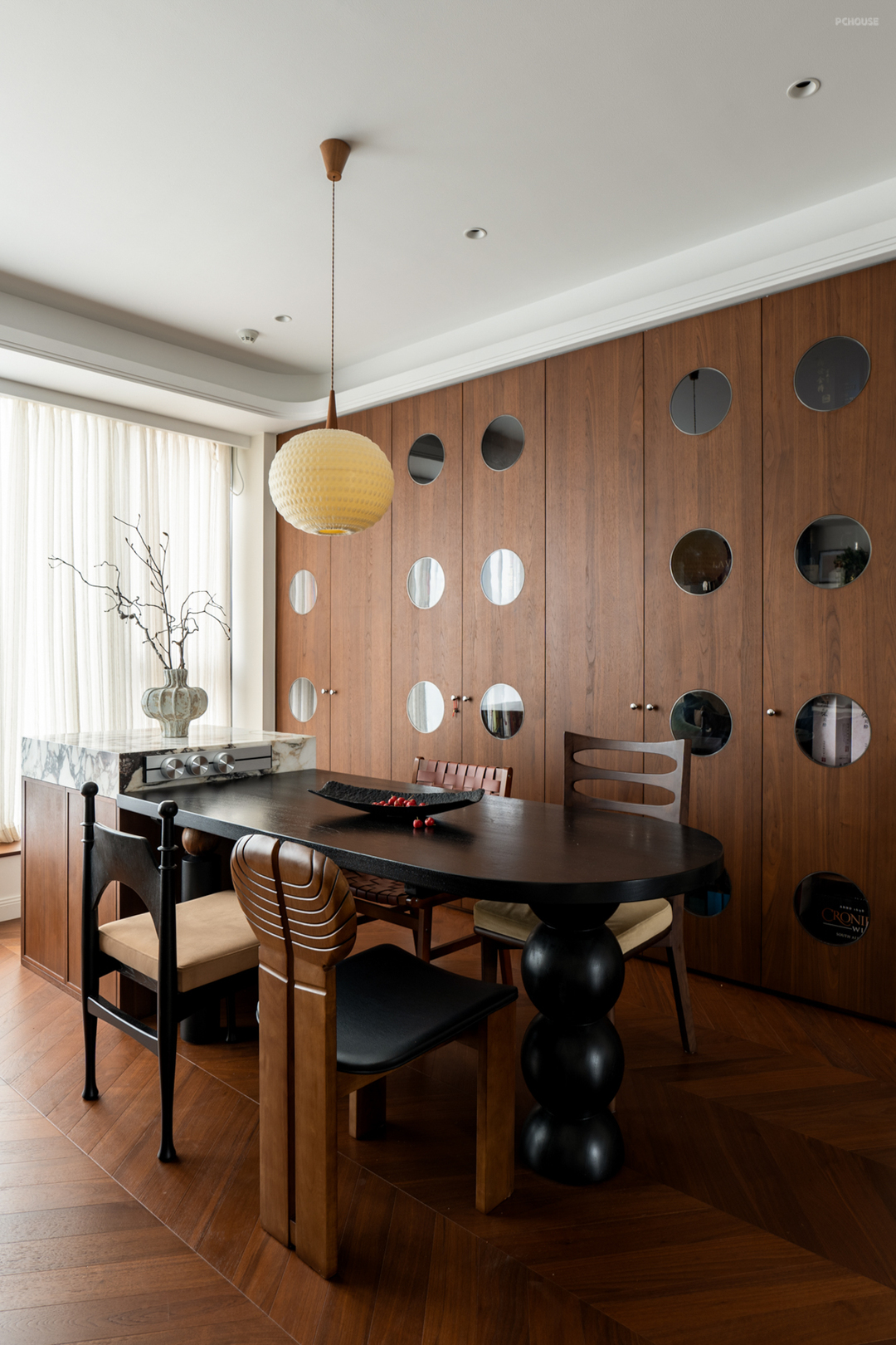 餐厅的长桌特意做了加长,除了满足一家人的用餐需求,这里也是小朋友做手工的区域。带有复古元素的可视化收纳墙,放着一家人的书籍,方便定位物品,也不破坏整体美感。