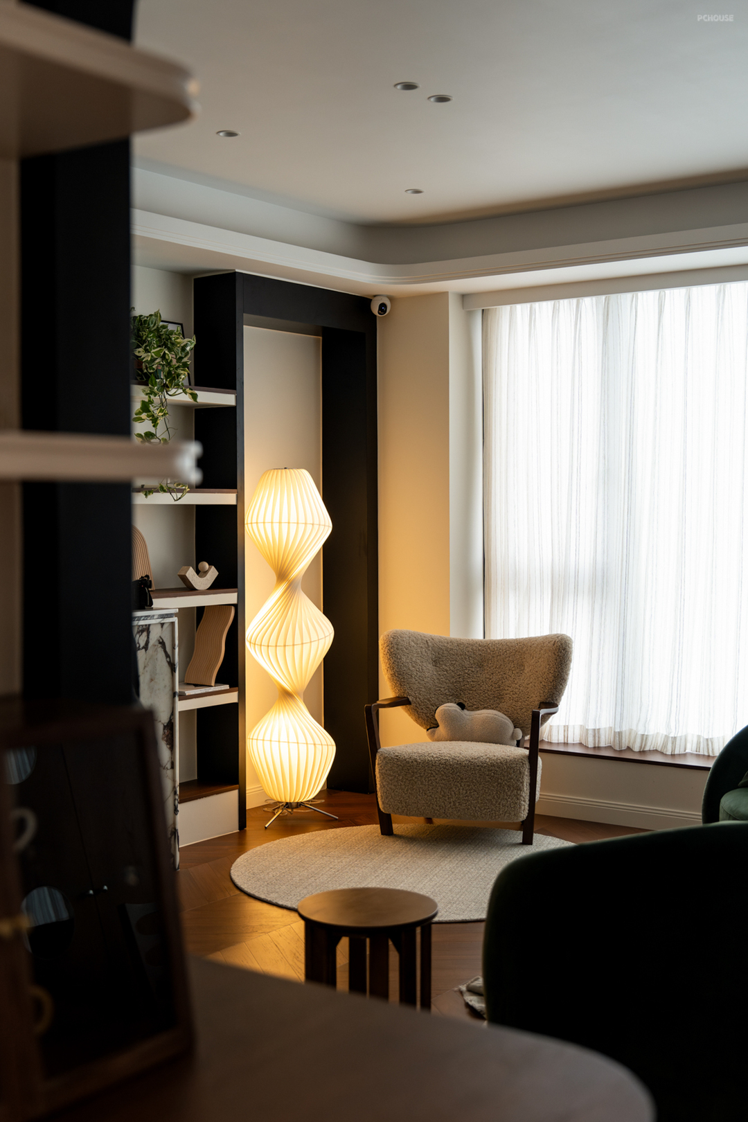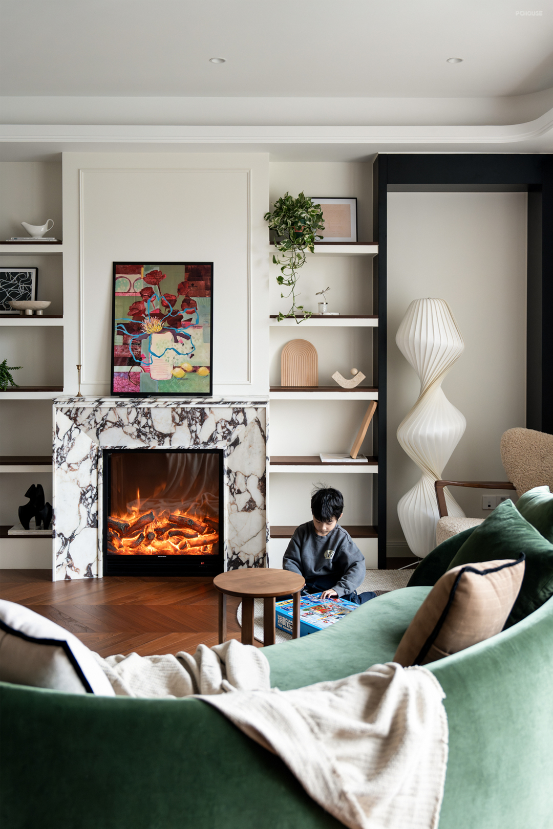 客厅看着很丰富,实际上没有太多固定的大件家具,希望创造出一个灵活、随性的空间,可以陪小朋友拼乐高、读绘本,给家人们留出自由支配的空间。