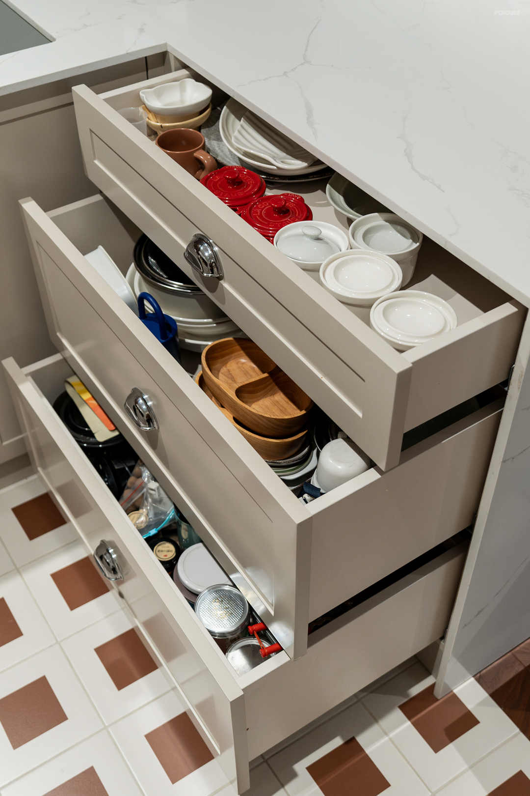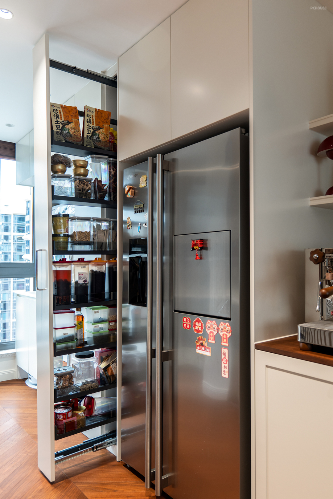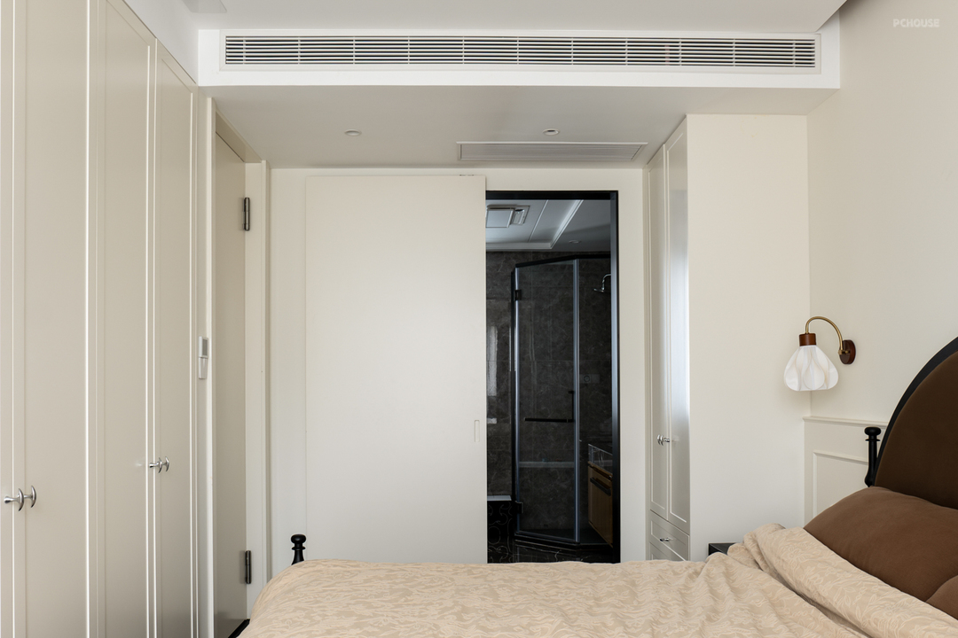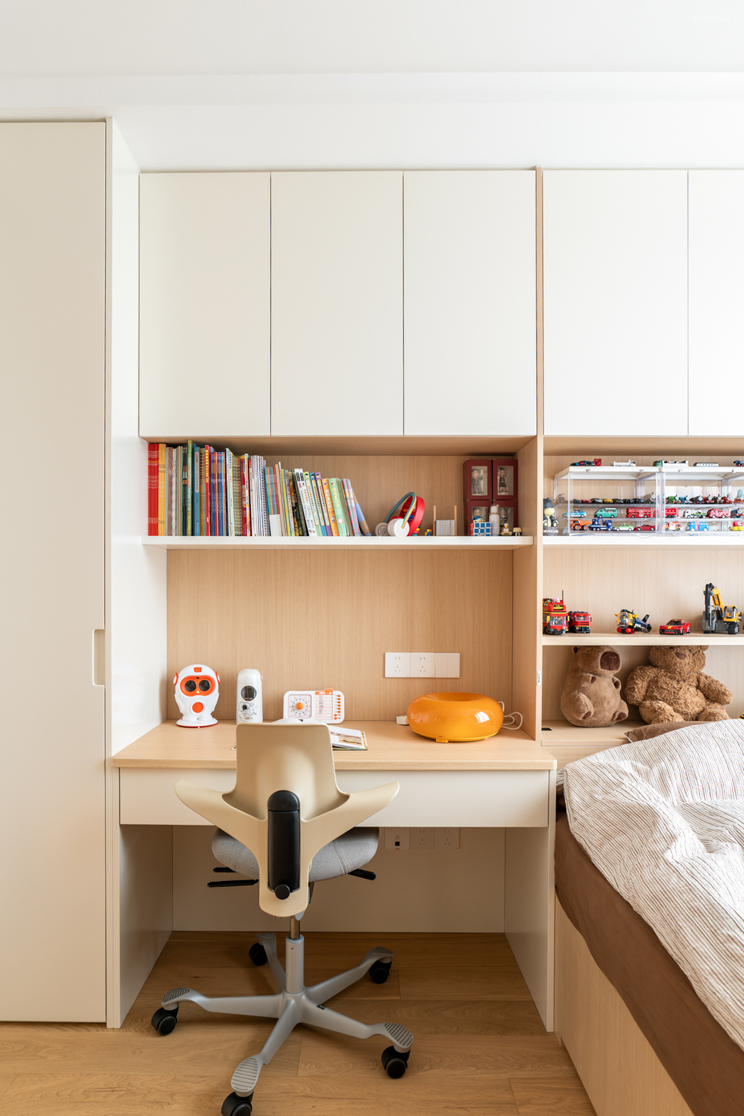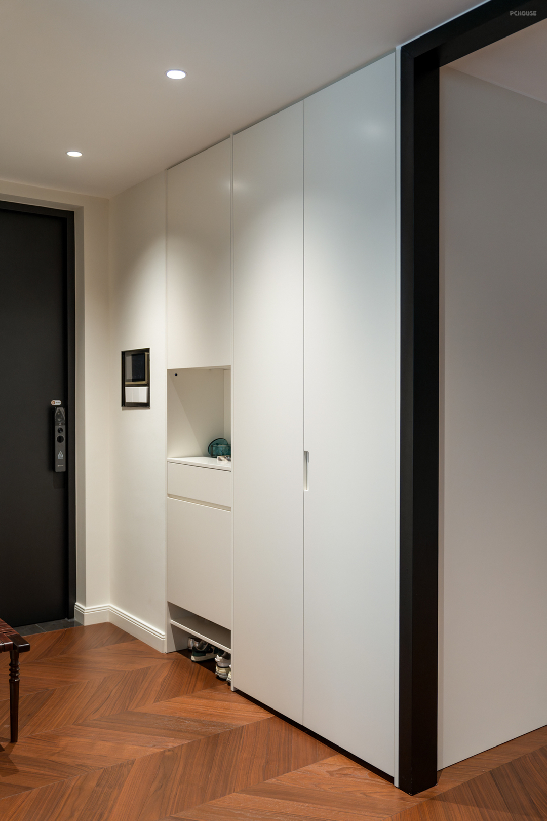根据家里的鞋帽衣物量、书籍量,收藏的碗碟杯具、玩具等非标品数量进行规划收纳。主卧只是调整了门洞位置,就释放了一整排的衣物收纳空间。