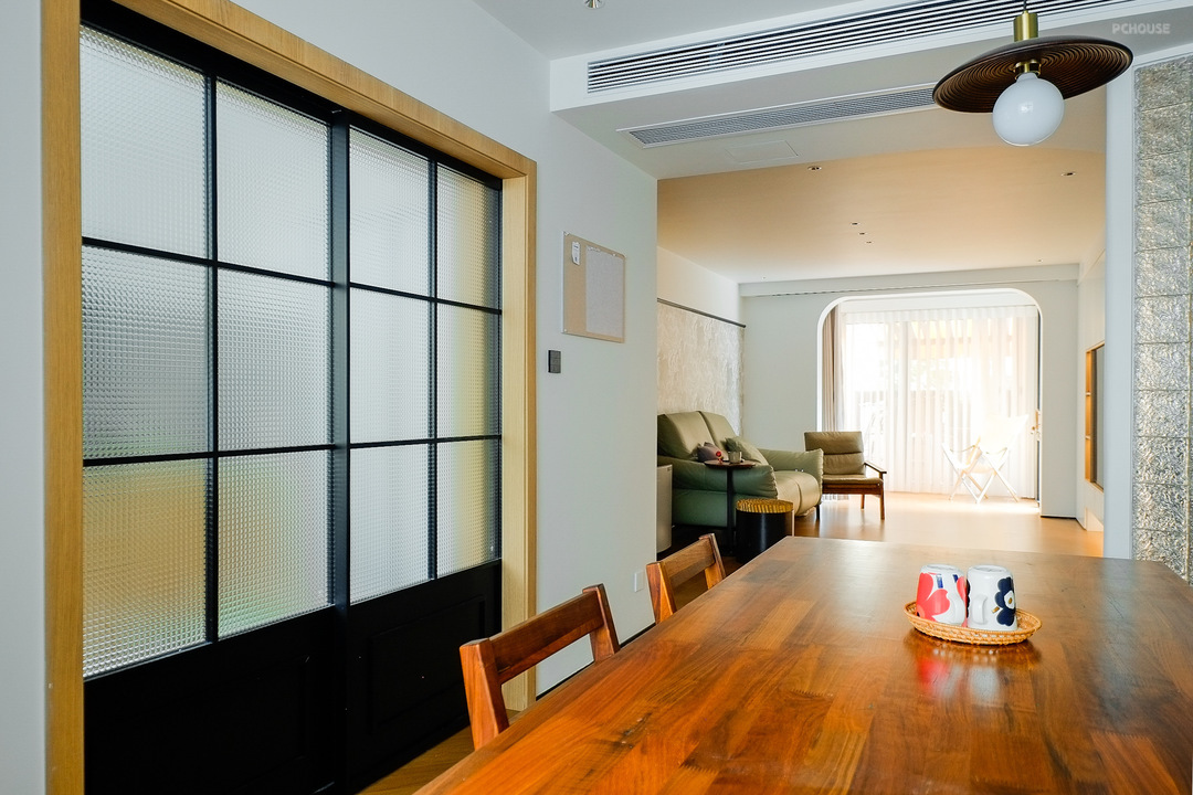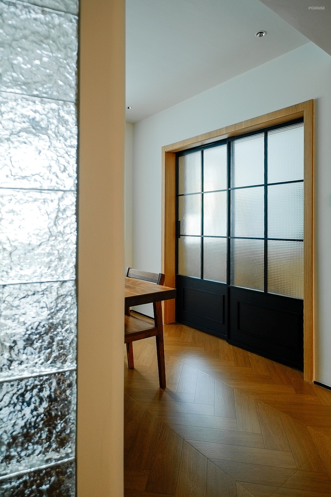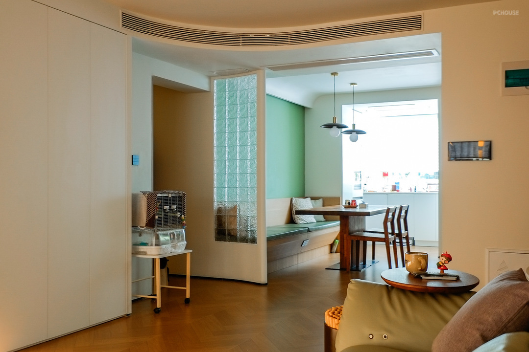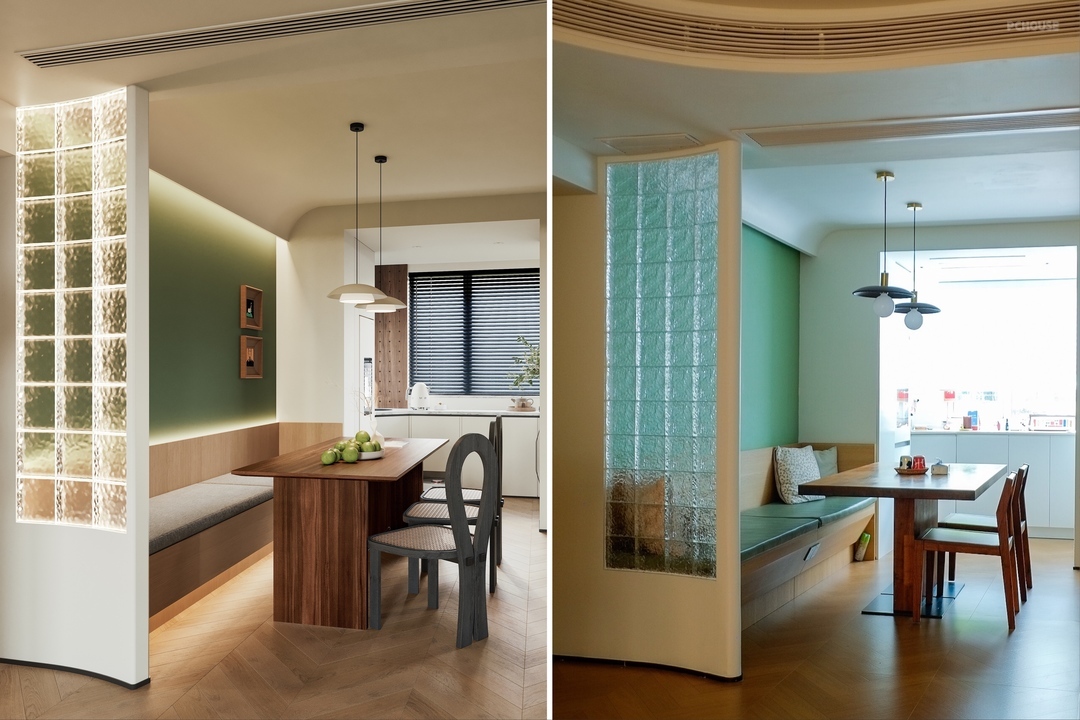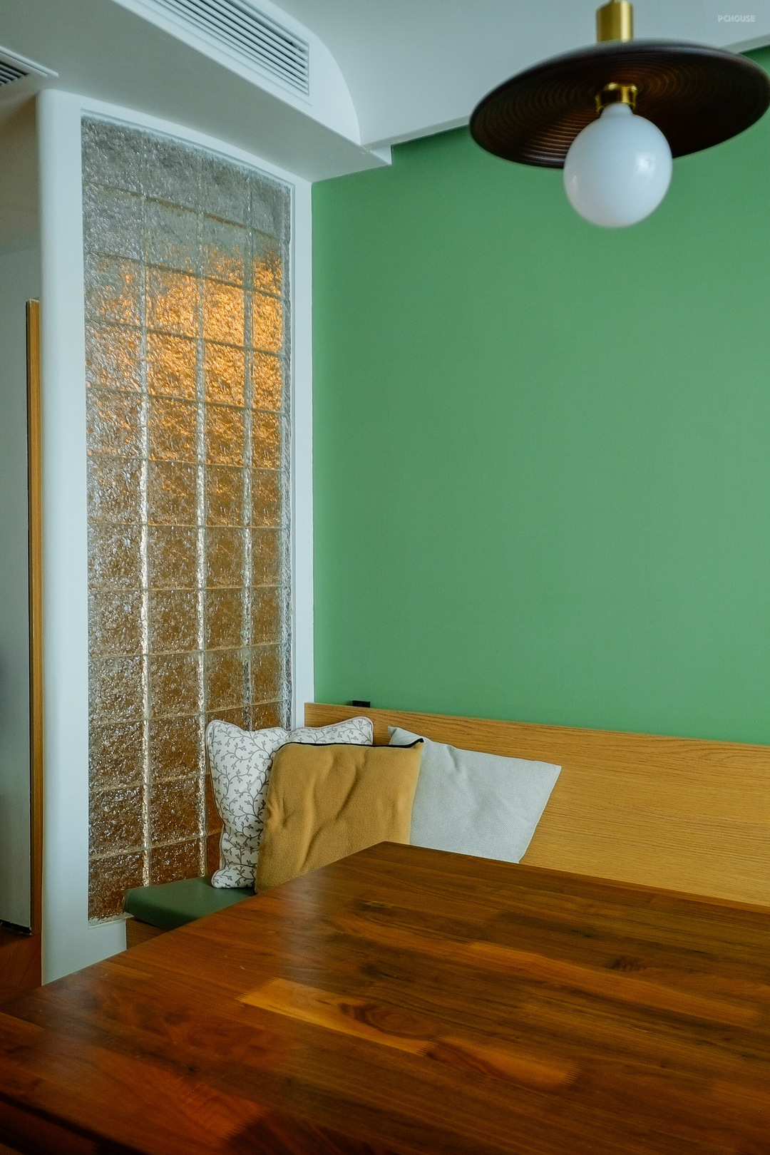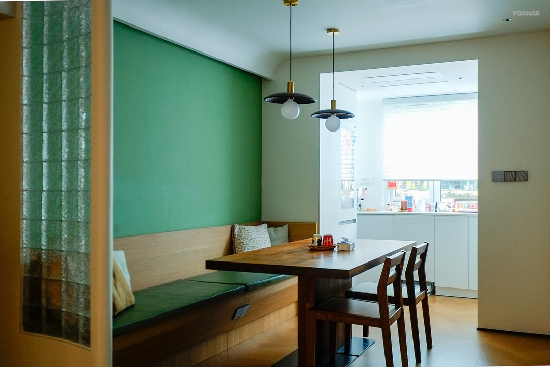 卡座一侧的隔墙,用玻璃砖进行装饰,我喜欢玻璃砖那种晶莹剔透却又朦胧的美。餐厅虽然在北侧,但是因为更靠近阳台窗户,所以下午这里的采光良好。家里的孩子也喜欢在这里的卡座上看书。
