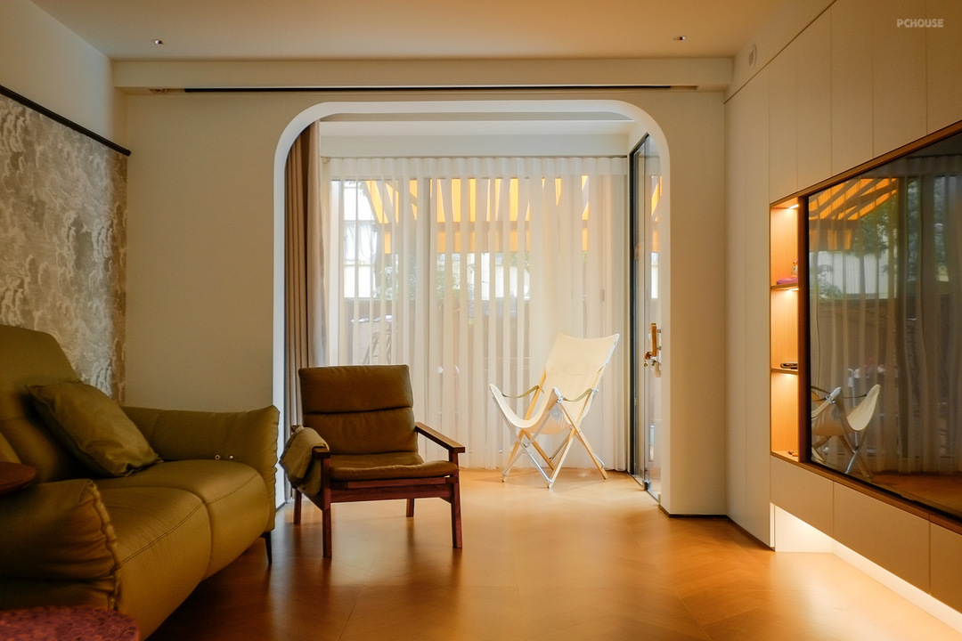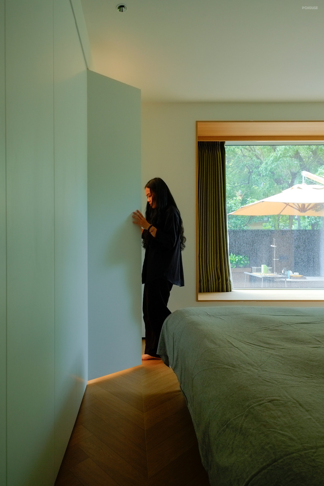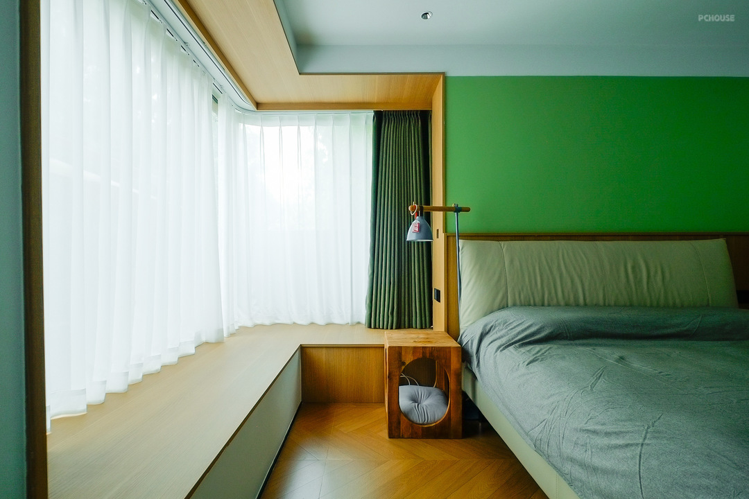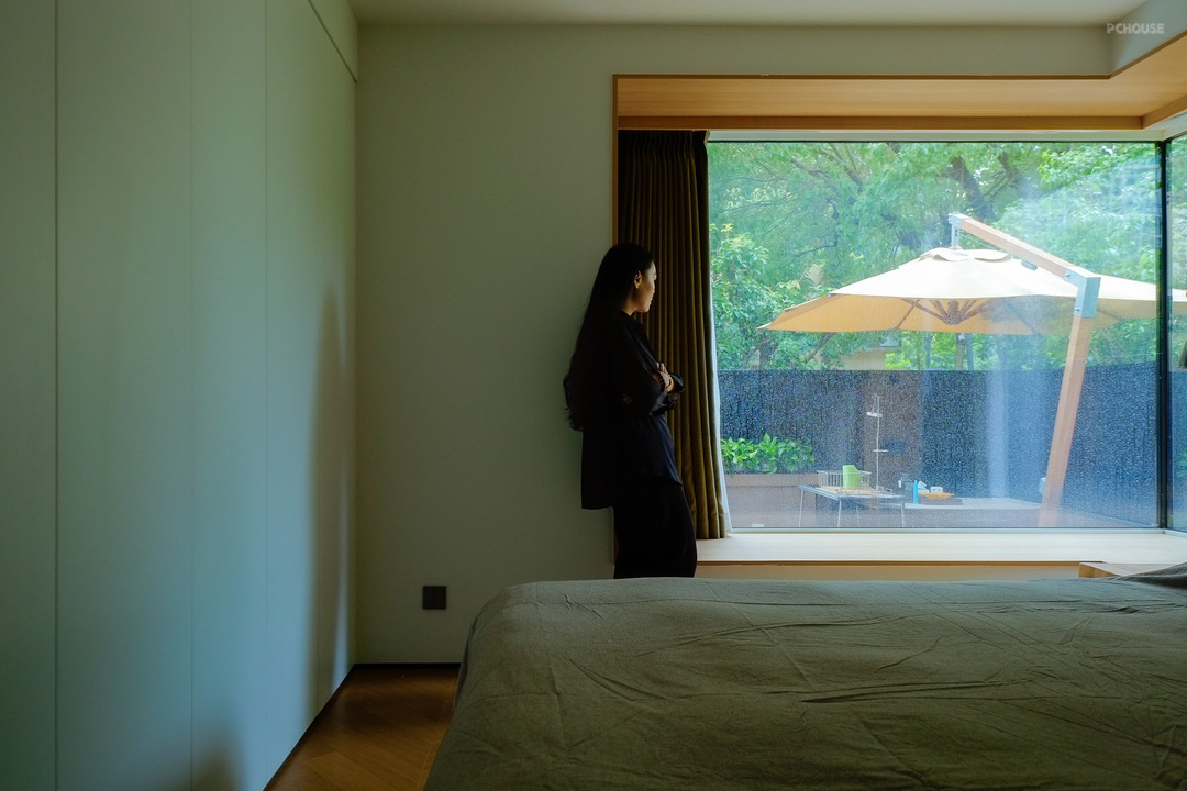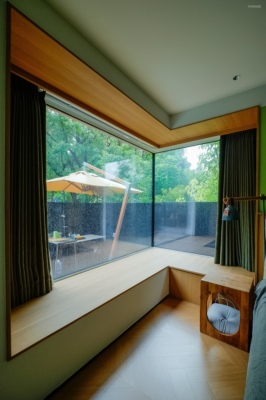 我们特意选择用木饰面包裹这个窗台,用整块的玻璃封装。就是希望在任何一个空闲的下午,家人都可以在这里小坐一会儿,看看风吹过树叶晃动的样子,看看孩子和小狗在院落玩耍的样子。