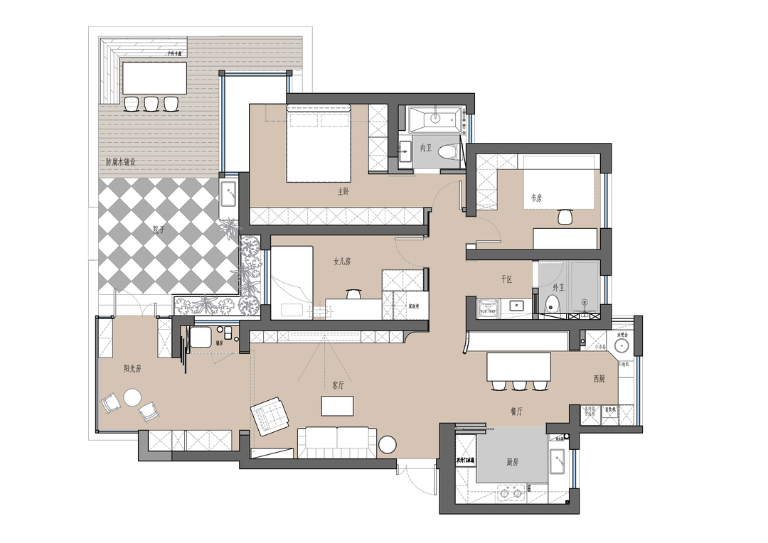 娱乐活动空间规划。根据不同的使用场景布置(麻将桌,投影,露营等)家人生活工作时间的不同场景安排。