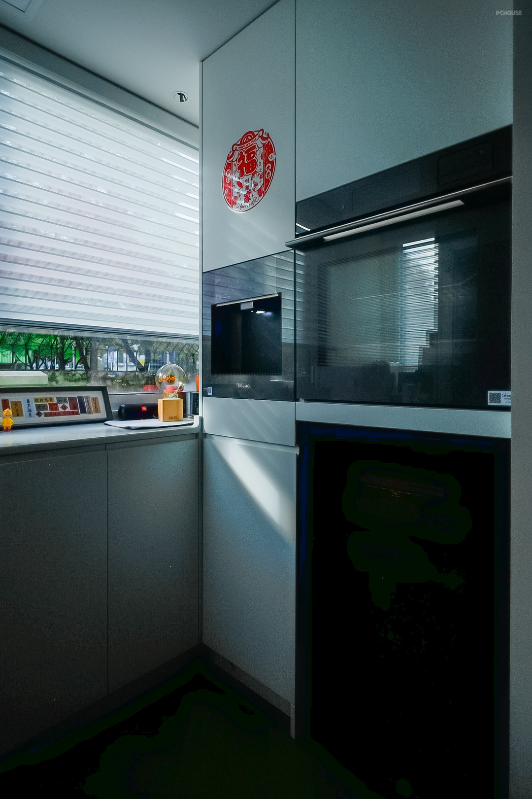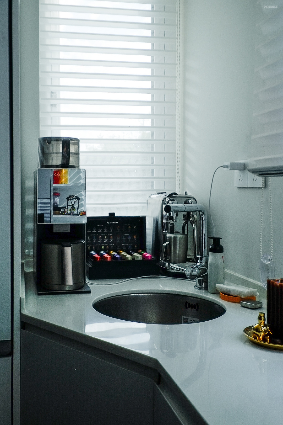 餐厅区域北侧的阳台,被做成了多功能的西厨,成为厨房功能的补充,这里可以存放常零食,咖啡,茶。让做饭和休闲饮食可以更好地区分开。