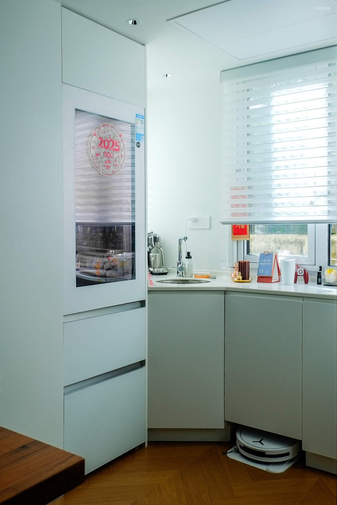 把柜子做成梯形,小小的水槽就能放置在角落,水池下面柜子的最深处,刚好可以放置地暖的分水器,不浪费可用空间。扫地机器人也安排上,这个位置打扫后返回清洁也是最短动线。