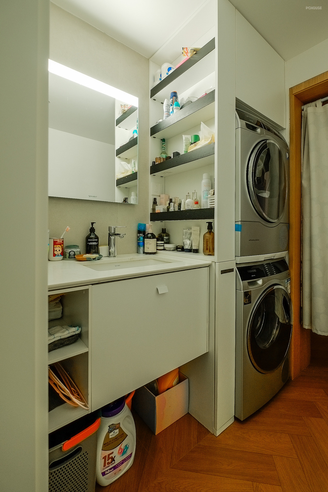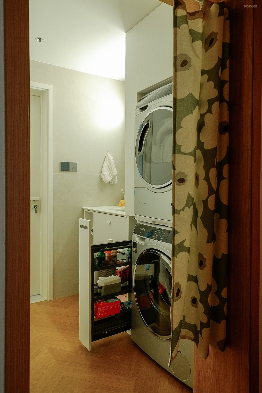 卫生间的宽度给台盆和洗衣机之间留出了一个狭小的尴尬尺寸。但观察我们在卫生间的使用场景,这里需要的正是小而有用的收纳空间。