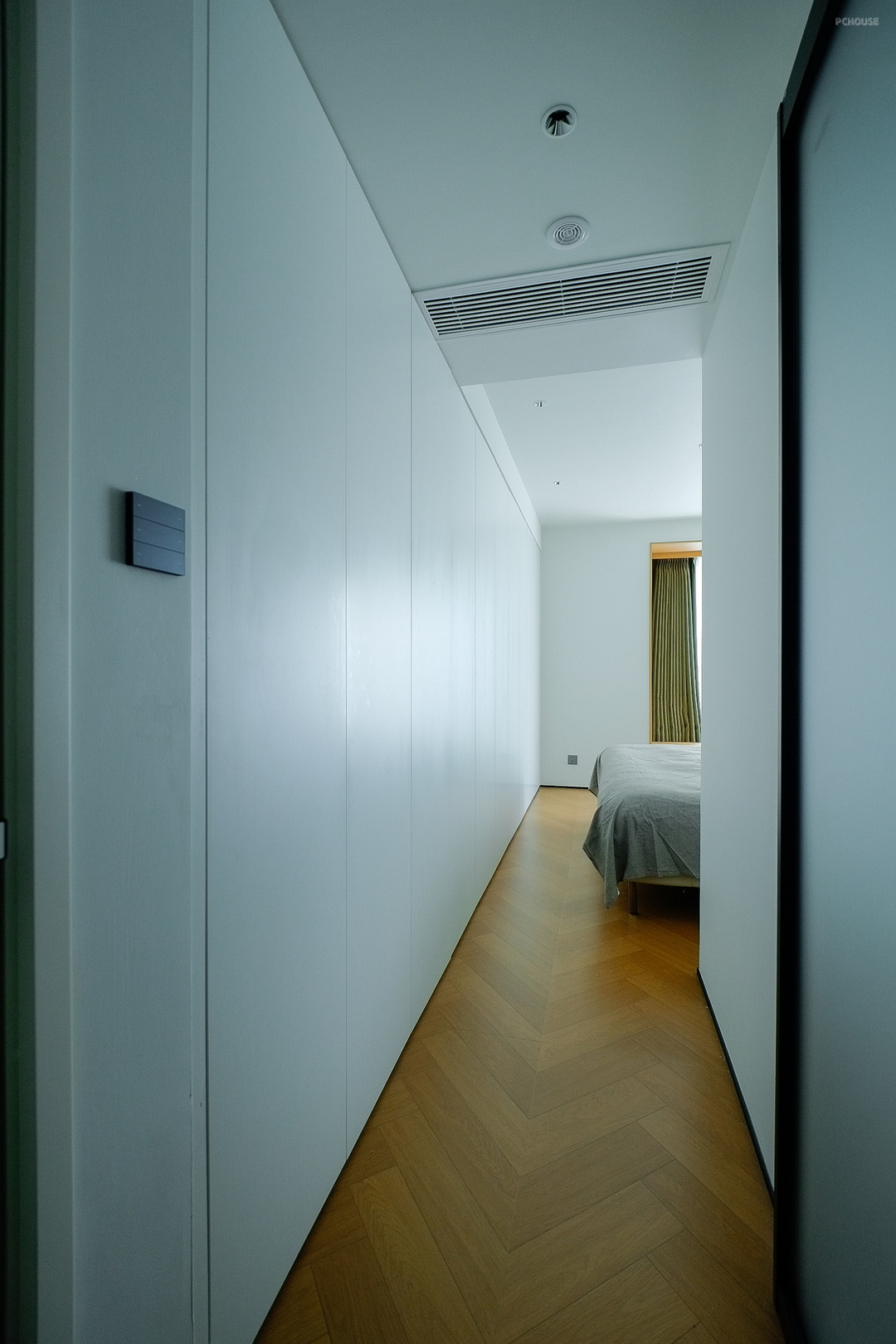 想要一个居住长久而不凌乱的房子,前期收纳的规划需要尽可能和硬装同步设计。我们在床对面布置了整面墙的衣柜,解决了家中各个季节的衣物,床品等的收纳问题。