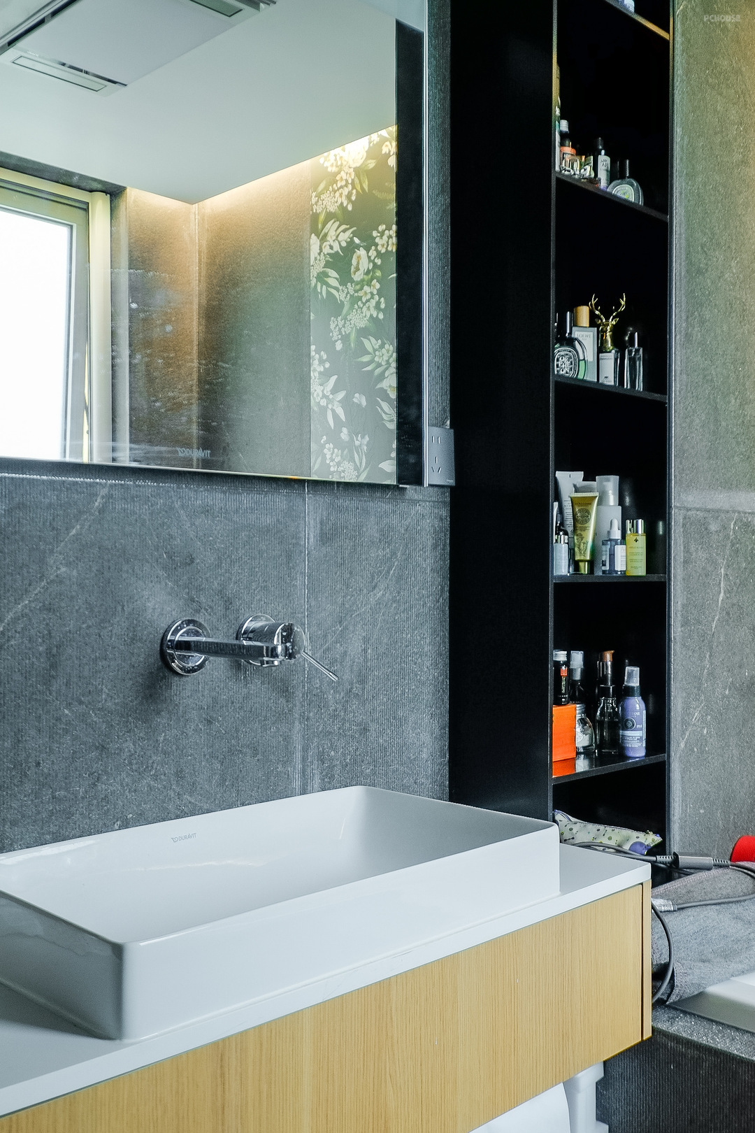 利用这里的空隙,我们在台盆右侧做了一个收纳开放格,洗漱用品可以随手放置,这里背对门口,并不会一眼看到凌乱,反倒是一个便利的收纳位置。