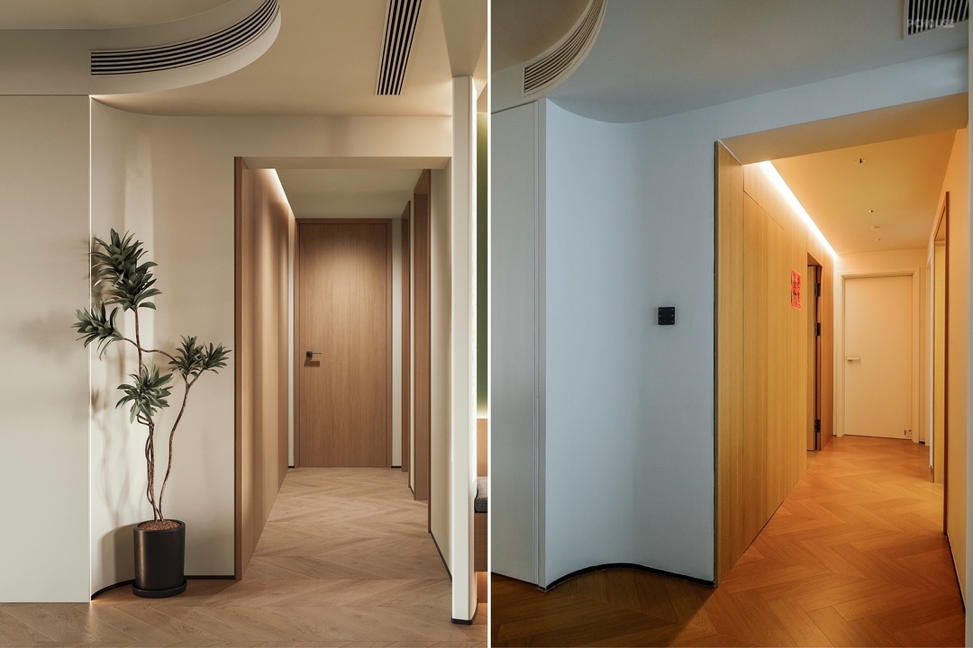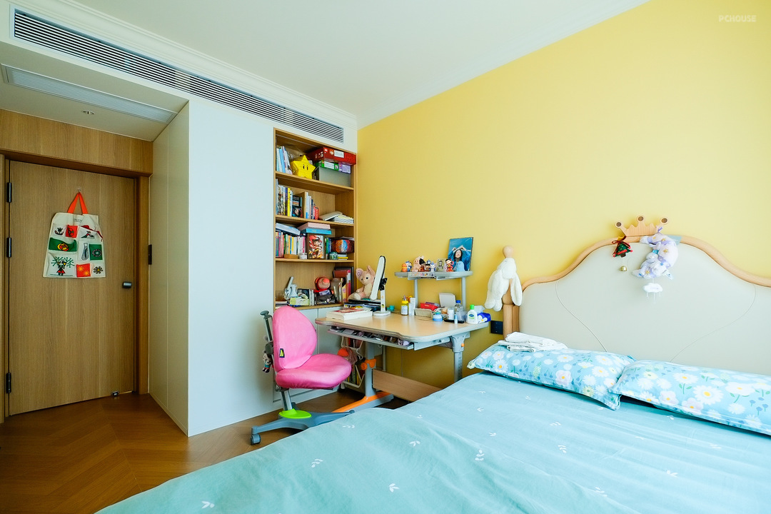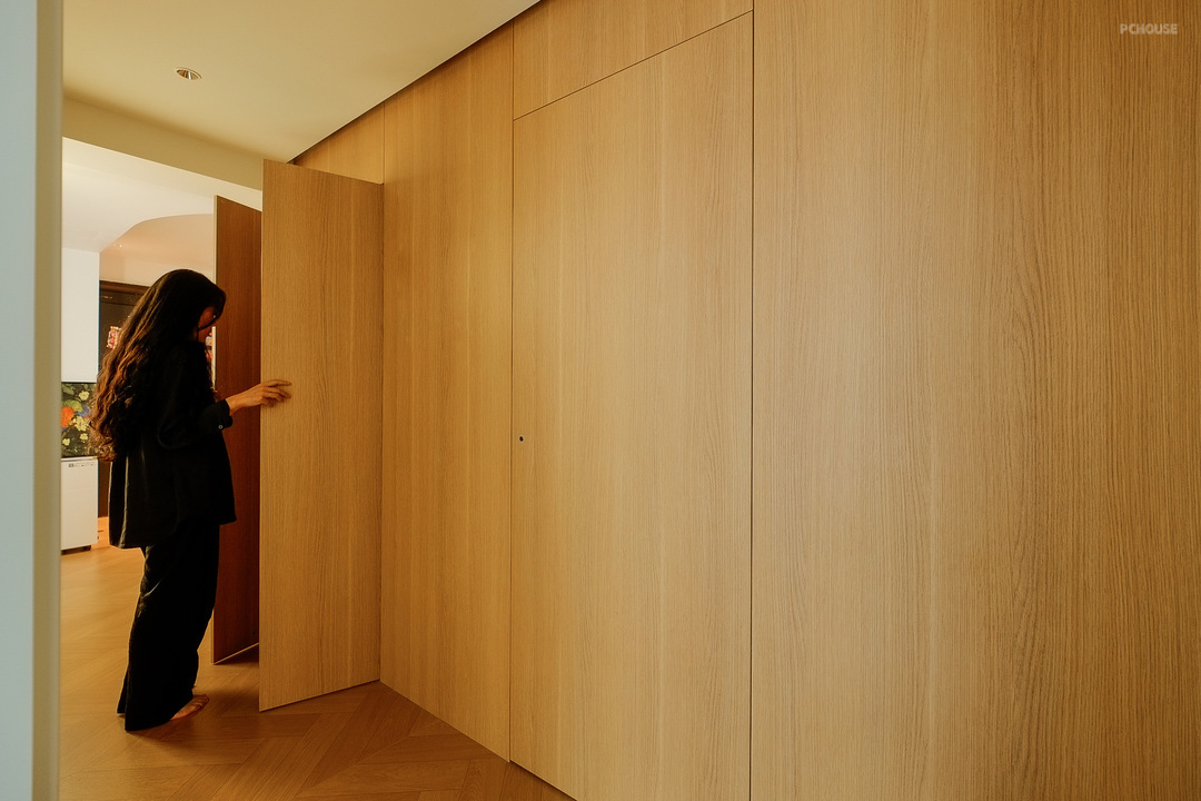 利用木饰面,让小朋友的房间成为家里的一个秘密房间。卧室都需要通过过道进入。而过道的价值不止于此,我喜欢利用过道创造出收纳和视觉的附加价值。