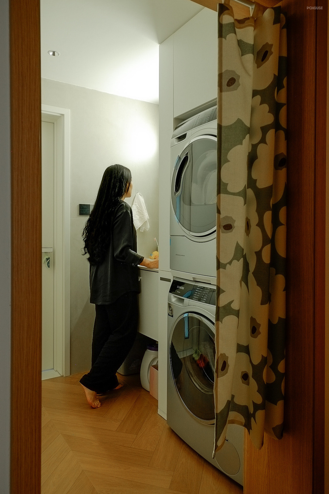希望创造舒适可以长时间居家的空间氛围。干湿分离,内卫配置日式小浴缸,布置家政空间。