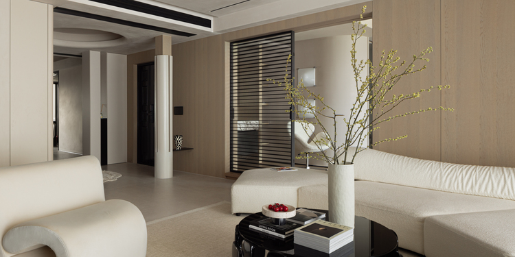 从餐厅视角看向整个客餐厅区域。阳台位置做了全包的木饰面,木饰面的加入,让整个公共空间从“理性克制”变得更“温润舒适”。