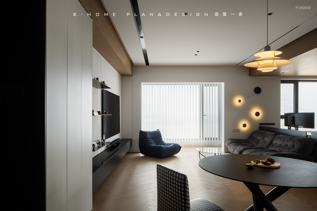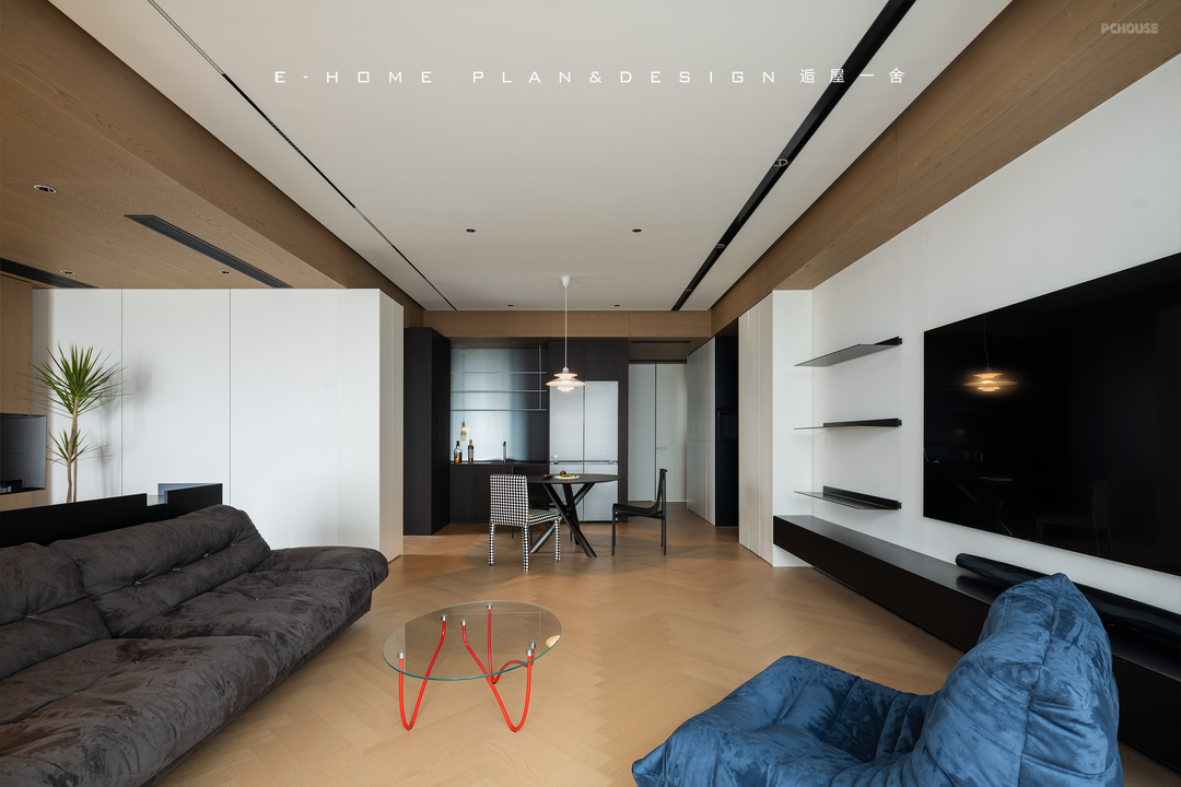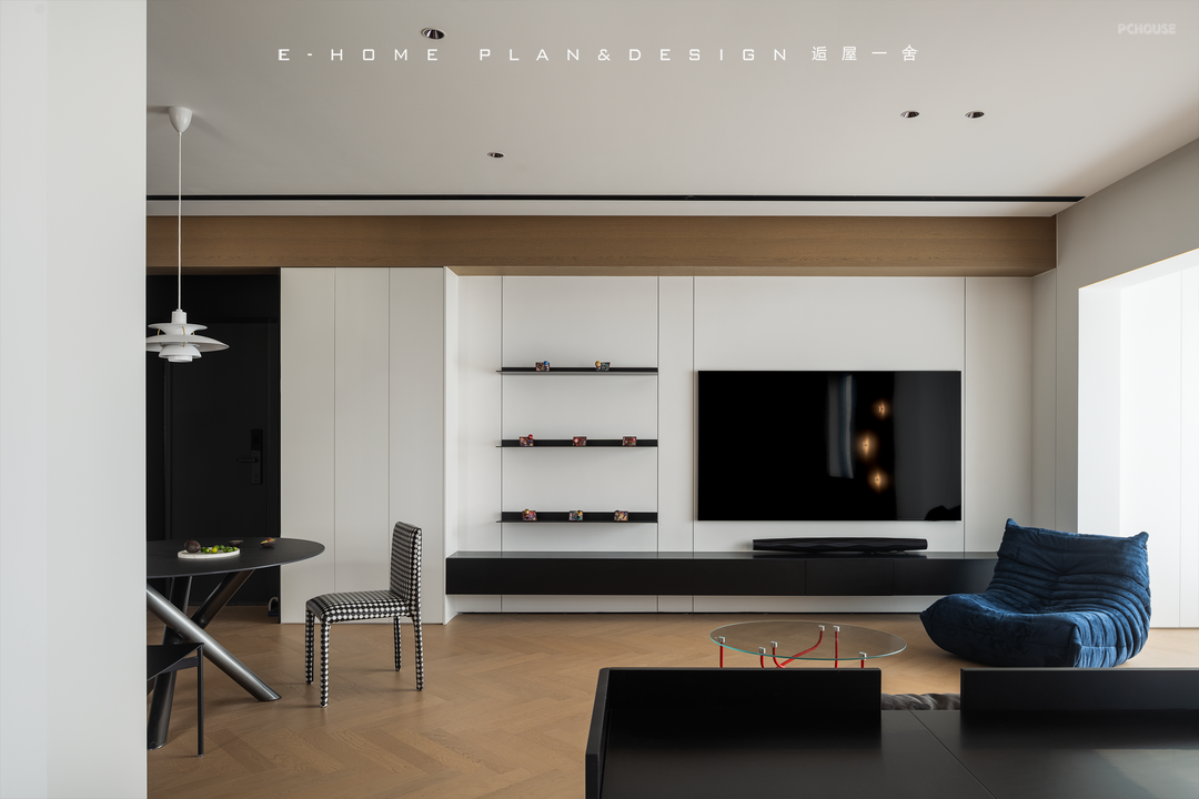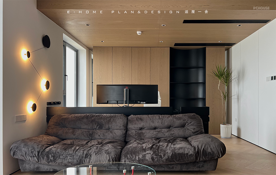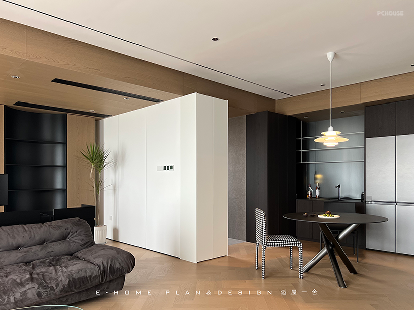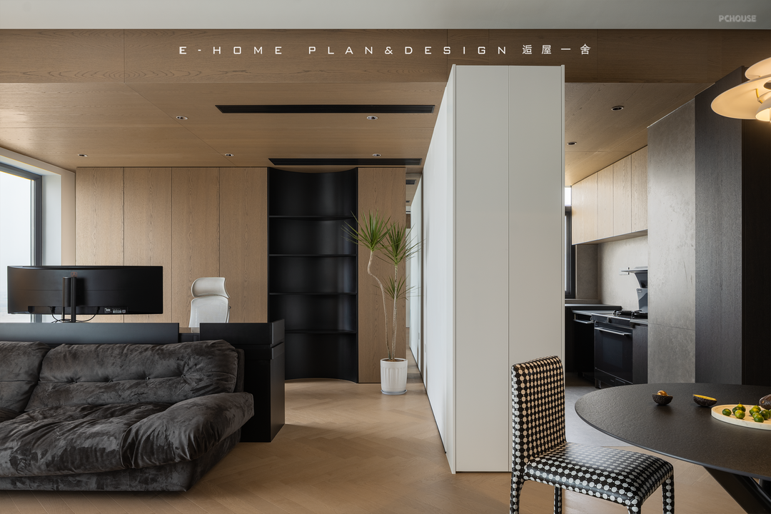 这个家里公共区域的划分很清晰,衍生出令人舒坦的秩序感,木地板和顶面木饰面是两条温暖的延伸,穿越经典黑白灰的清爽利落。