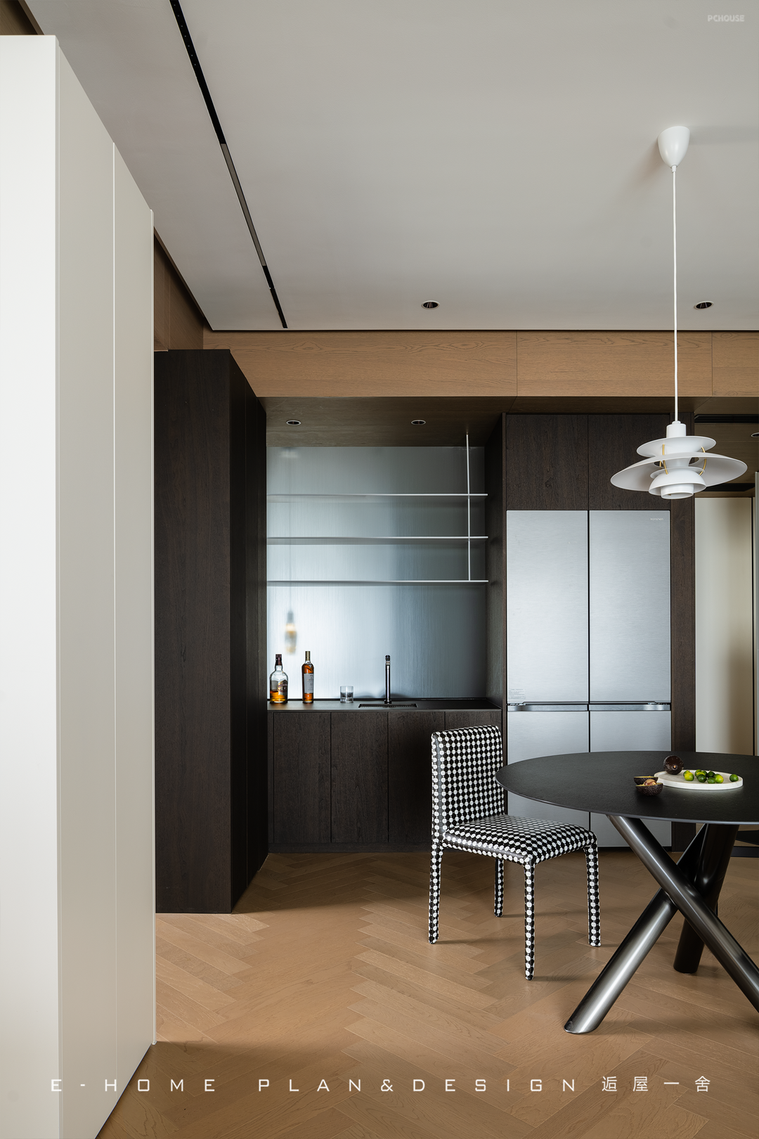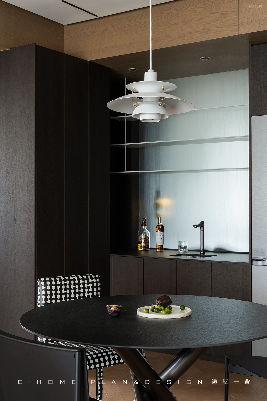 原有厨房功能单一,设计师借用结构的错位,增加了西厨空间,就连冰箱也可以从厨房腾出而不显突兀,灵活轻巧的圆桌是这里的好选择,围绕的暗色餐边柜藏着用餐的多种用途,操作台的背后艺术玻璃,借用了背后走廊的光线进入,在每个细节上考虑着生活的便利性。