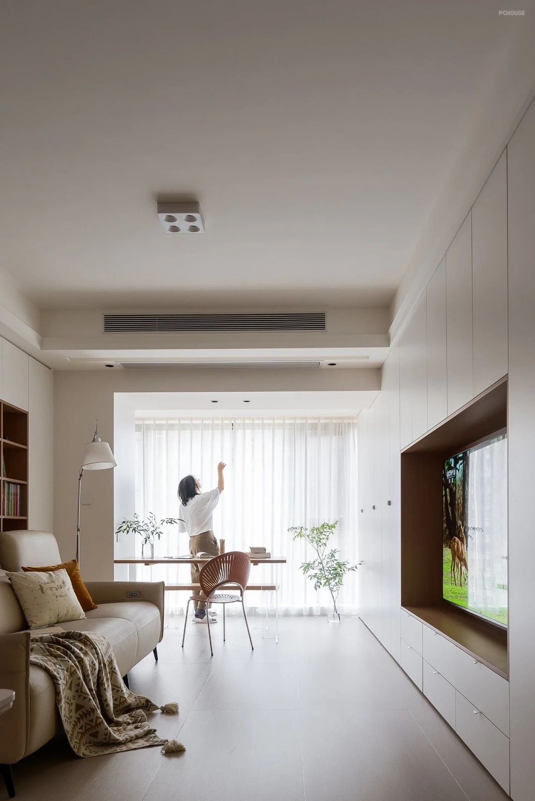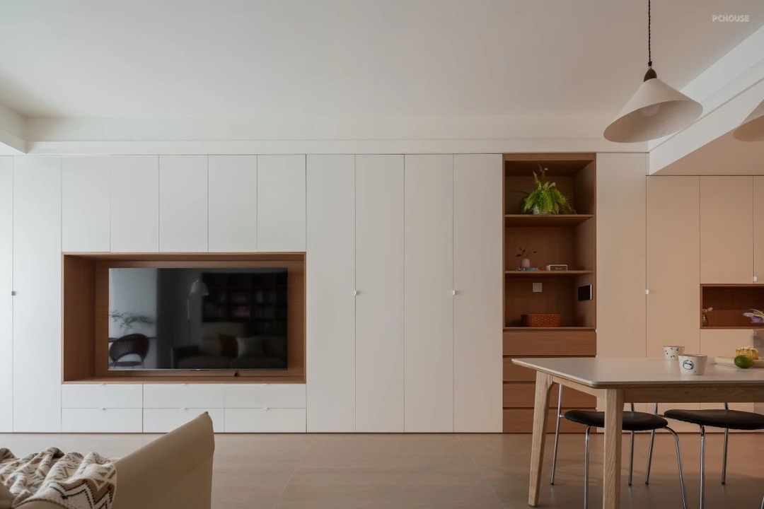 整合了电视柜/杂物柜/鞋柜集一体的一整面到顶柜体完美落地,家里有再多物品也不担心啦~