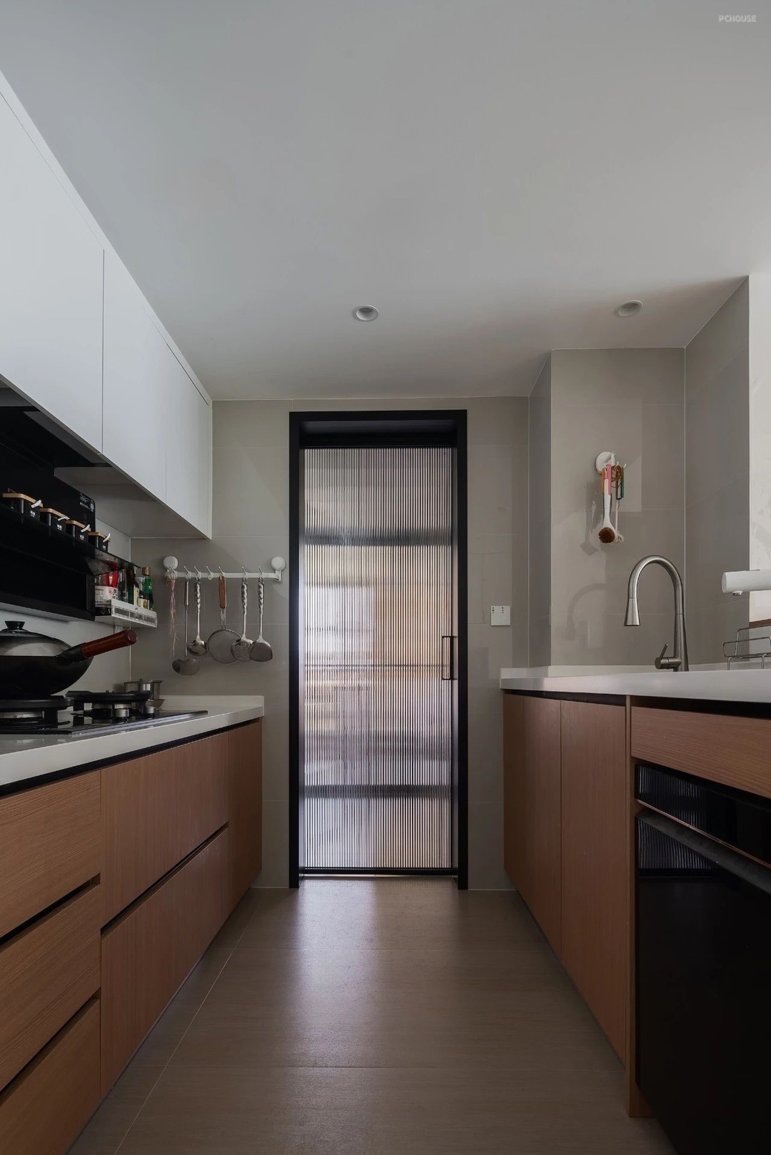 厨房利用地柜位置用板材向上延伸,不仅使得空间上更美观,同时也利用延伸出来的位置埋了滑轨插座,下面的宽度也见缝插针式地做了小小收纳柜。