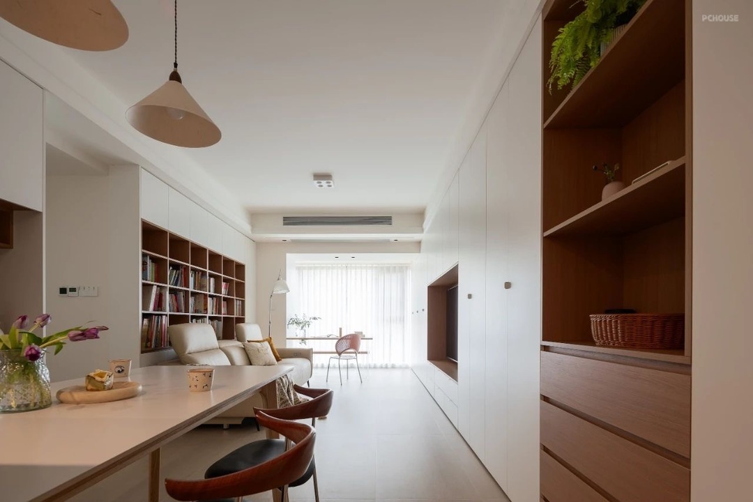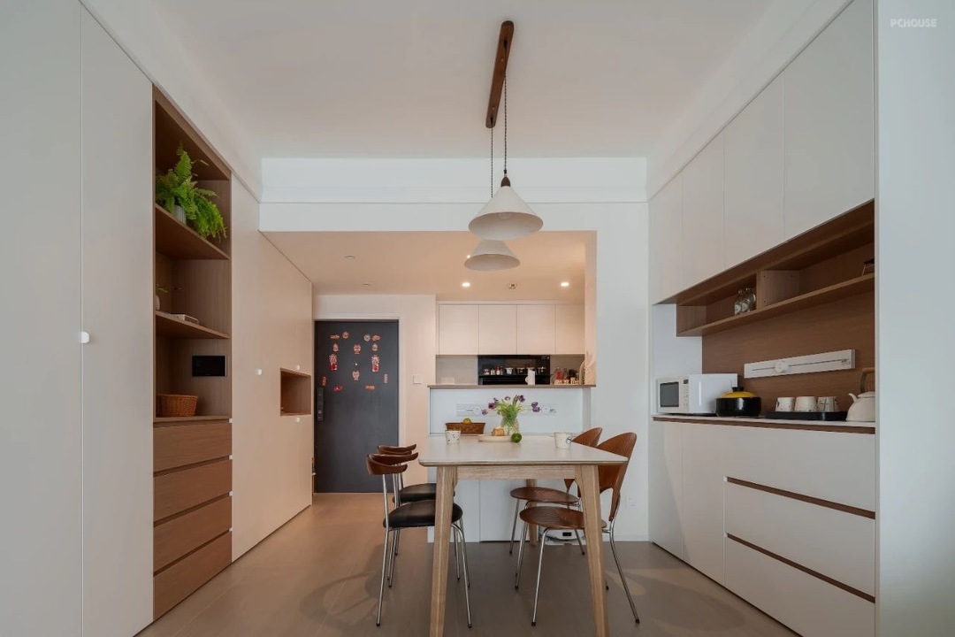 从厨房看向客厅。当家里人员、物品过多,收纳就成为了重中之重,做好规划,东西再多也不怕杂乱无章。