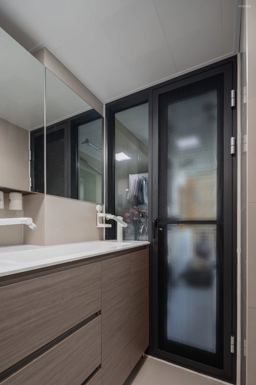 专门定制的可丽耐长水槽+双水龙头。双水龙头的设计也是照顾到了家里人口较多,高峰期洗漱紧张的问题。