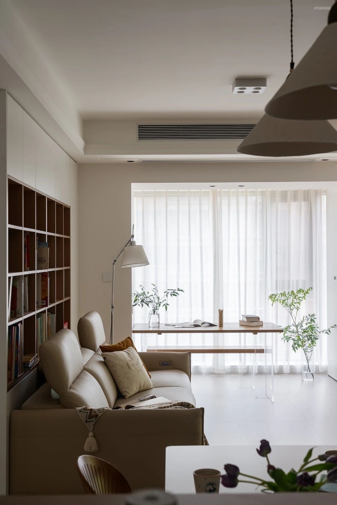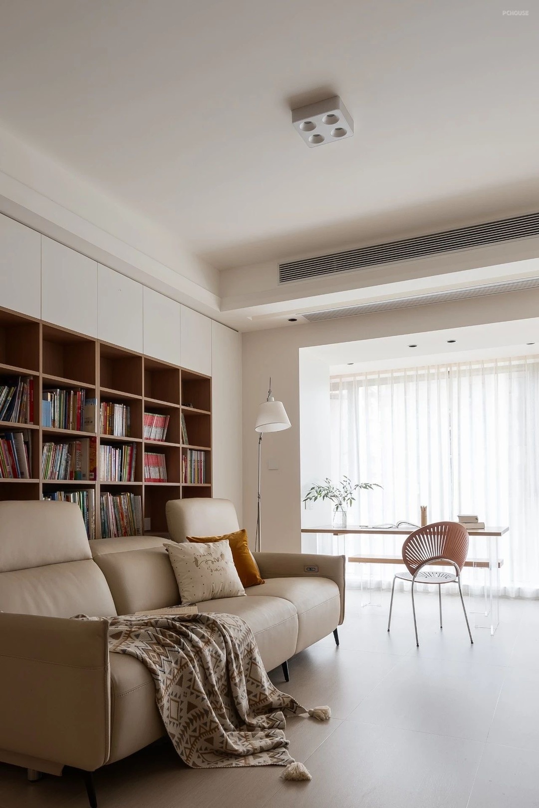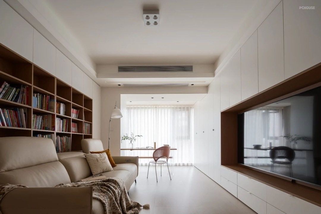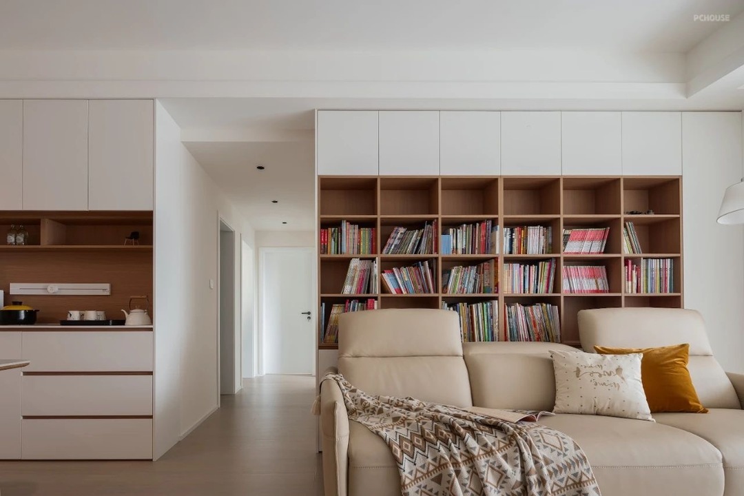 沙发背后也是做了一整面的柜体。上半部分是开放格书柜,放置家里人的读物;下半部分则是封闭式柜体,用于放置一些药品文具等小物件。