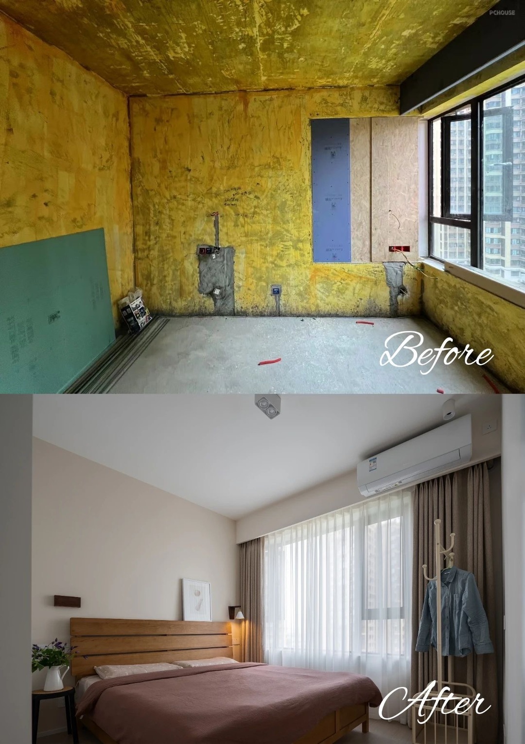改造前后对比,床头的窗户考虑到风水所以直接封闭了。