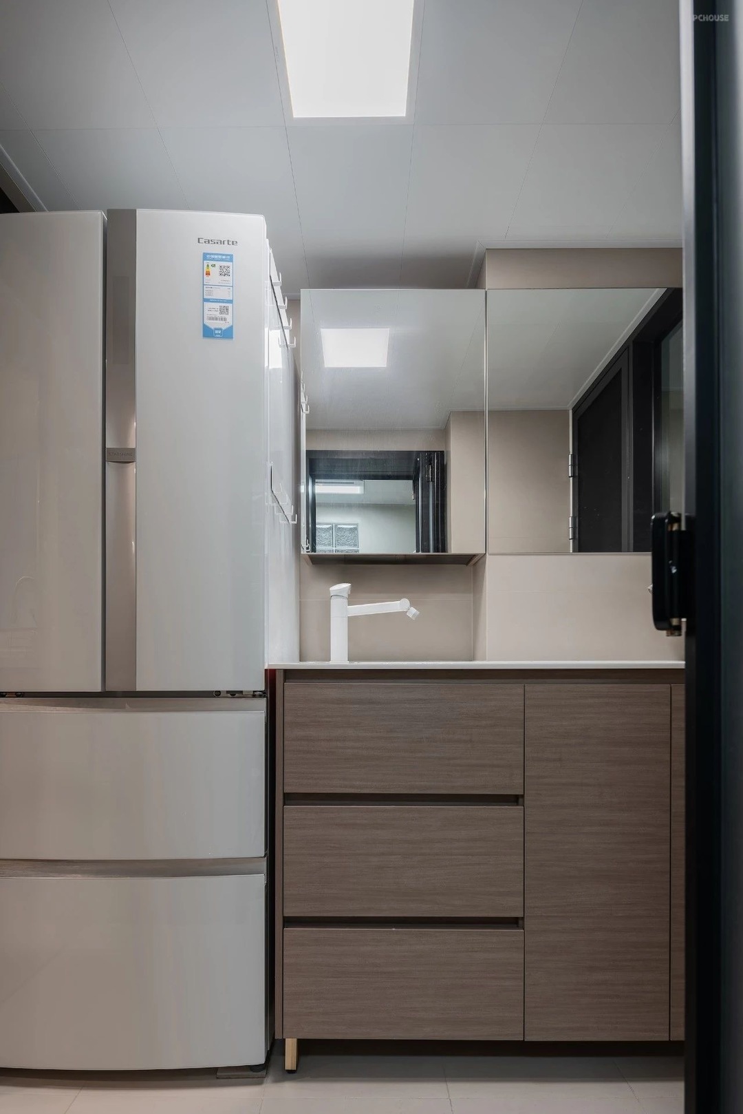 借用一部分生活阳台的位置,将冰箱和卫生间干区外移。