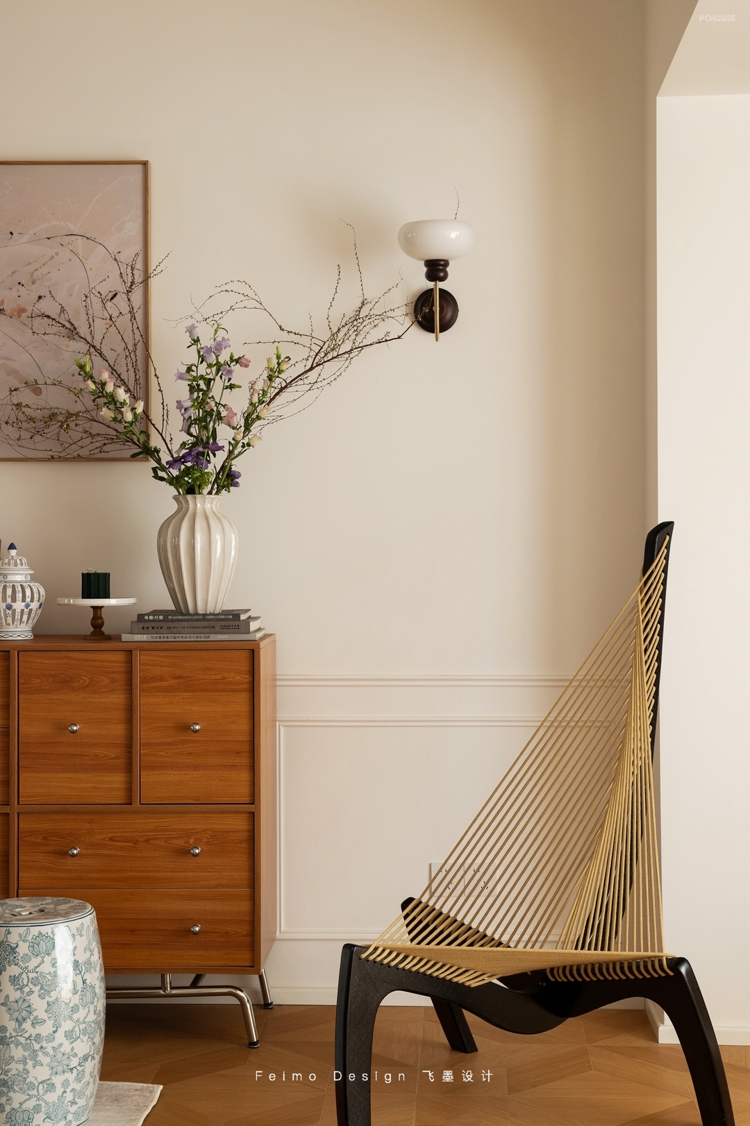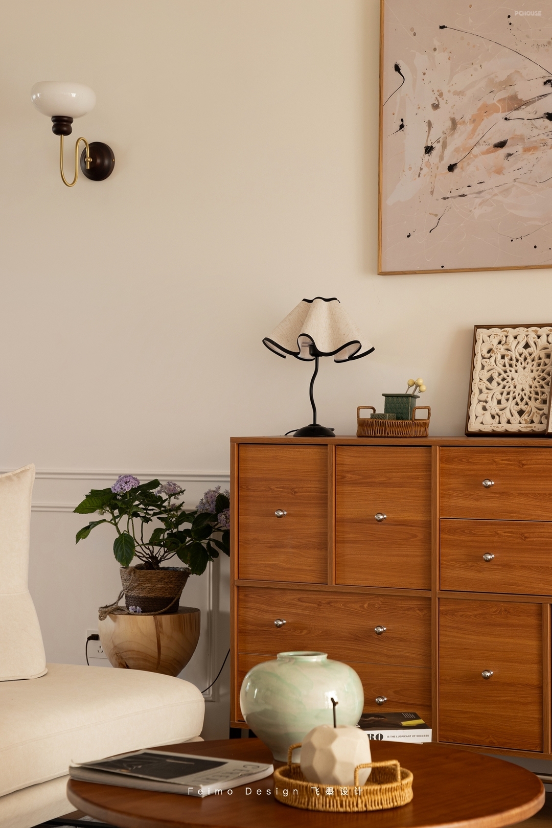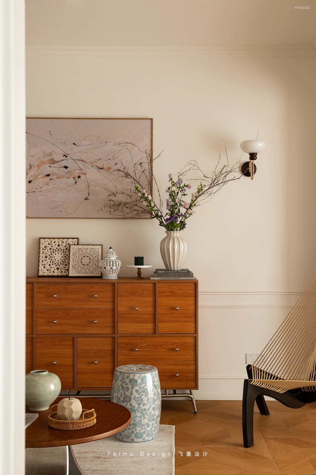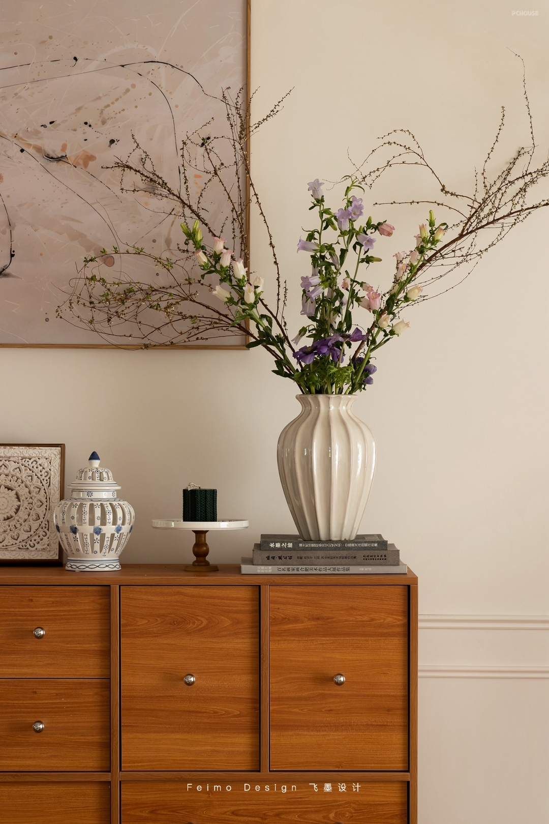 客厅与阳台打通,足够开阔的空间给客厅布局更多的选择;沙发围合摆放,成全松弛自在的生活;石膏线简约精致,勾勒空间的线条感;一张斗柜,一幅挂画,每一件器物,都有自己独属的温度。