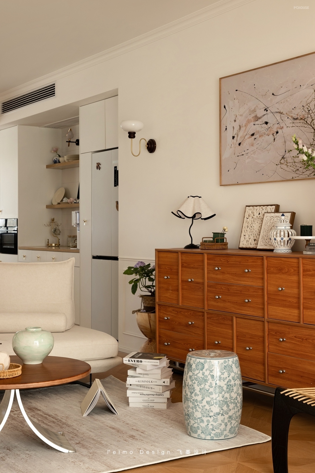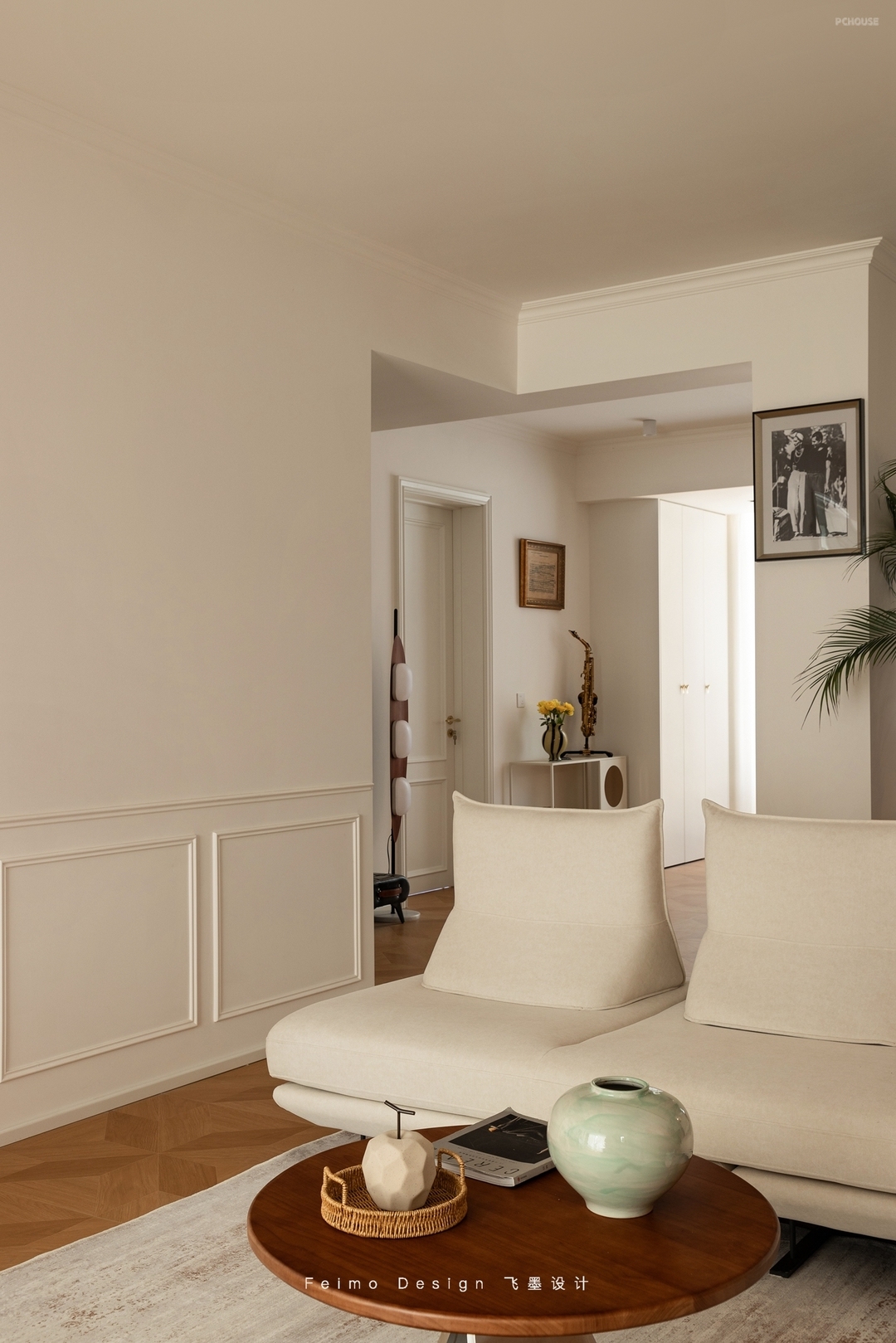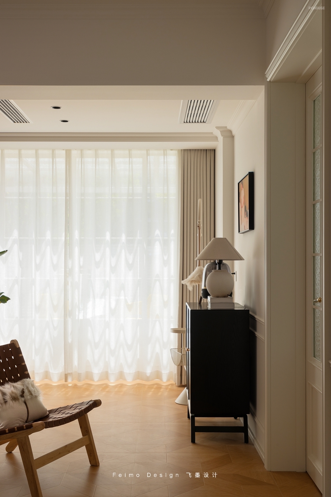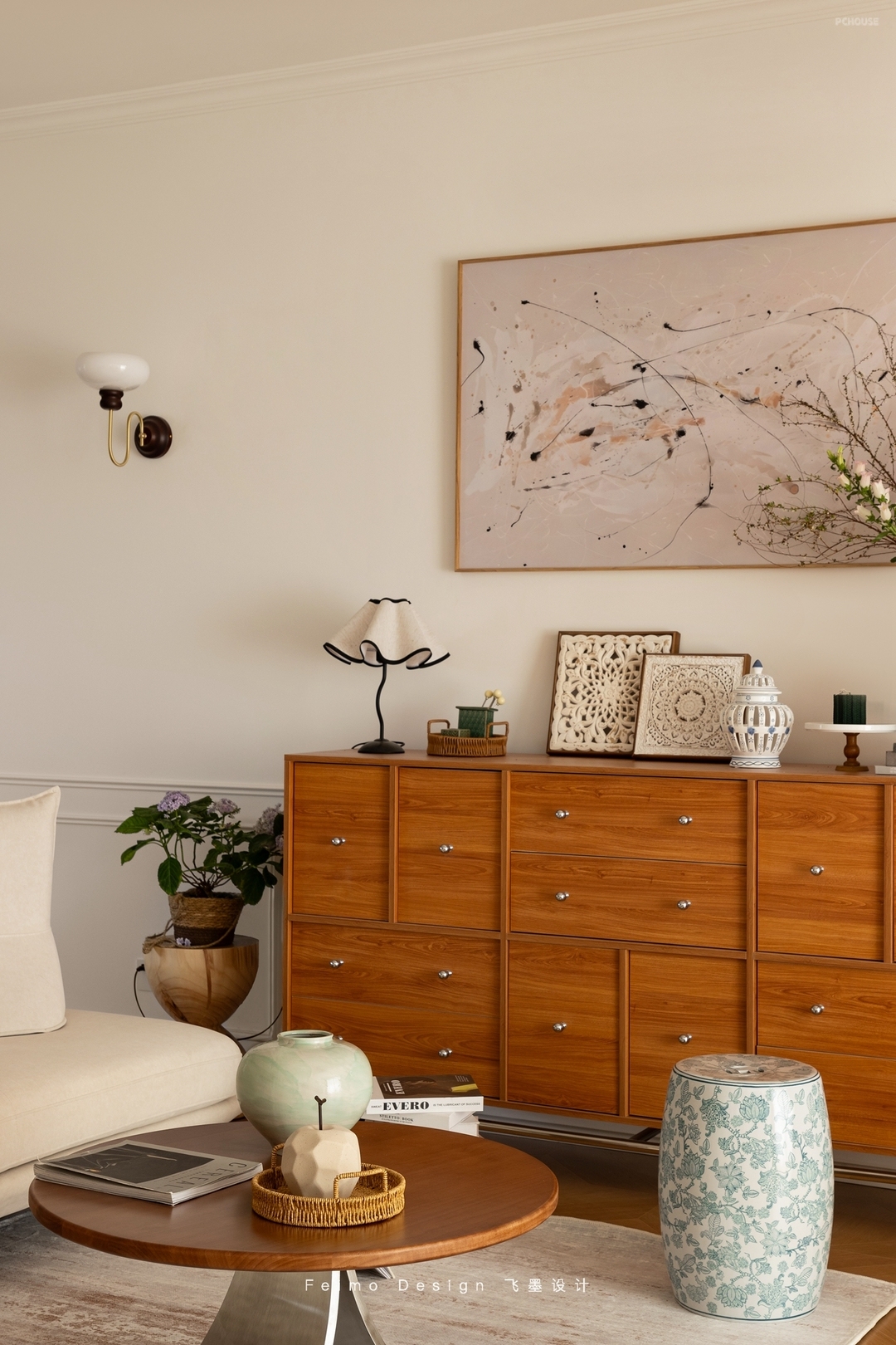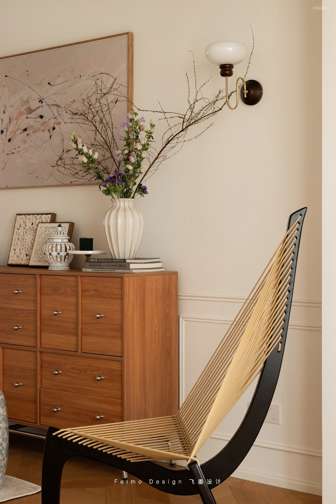 客厅与阳台打通,足够开阔的空间给客厅布局更多的选择;沙发围合摆放,成全松弛自在的生活;石膏线简约精致,勾勒空间的线条感;一张斗柜,一幅挂画,每一件器物,都有自己独属的温度。
