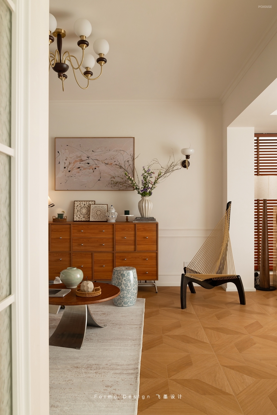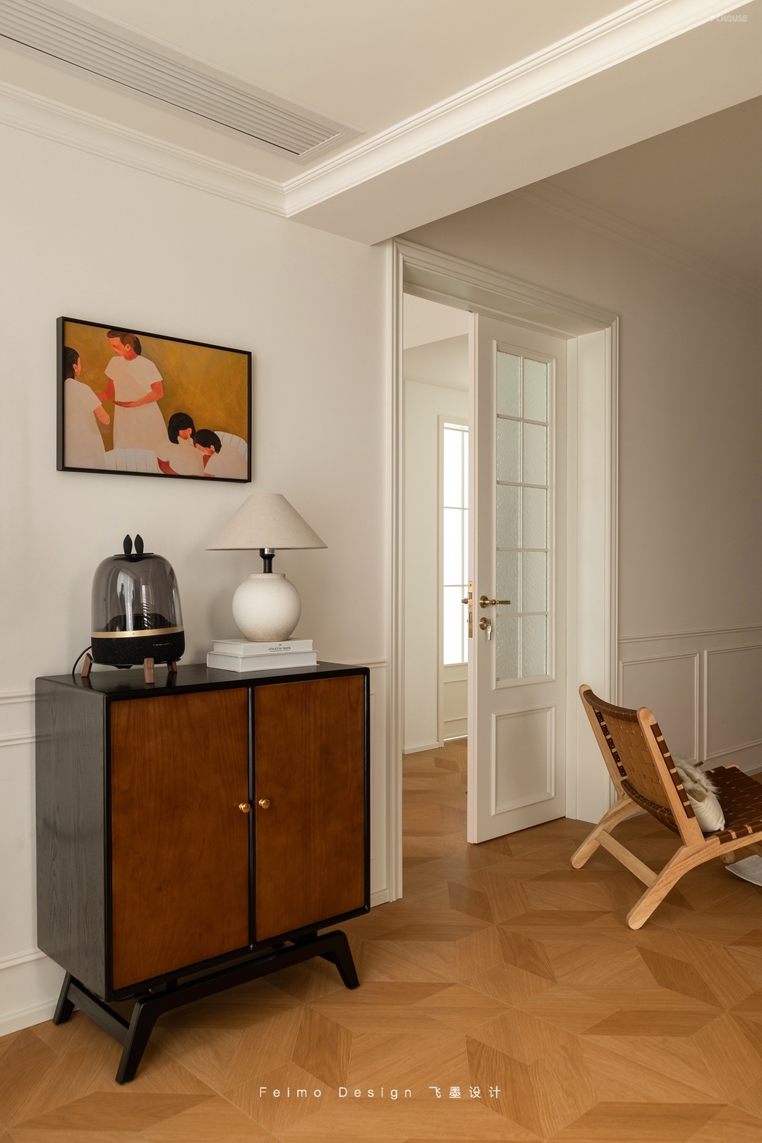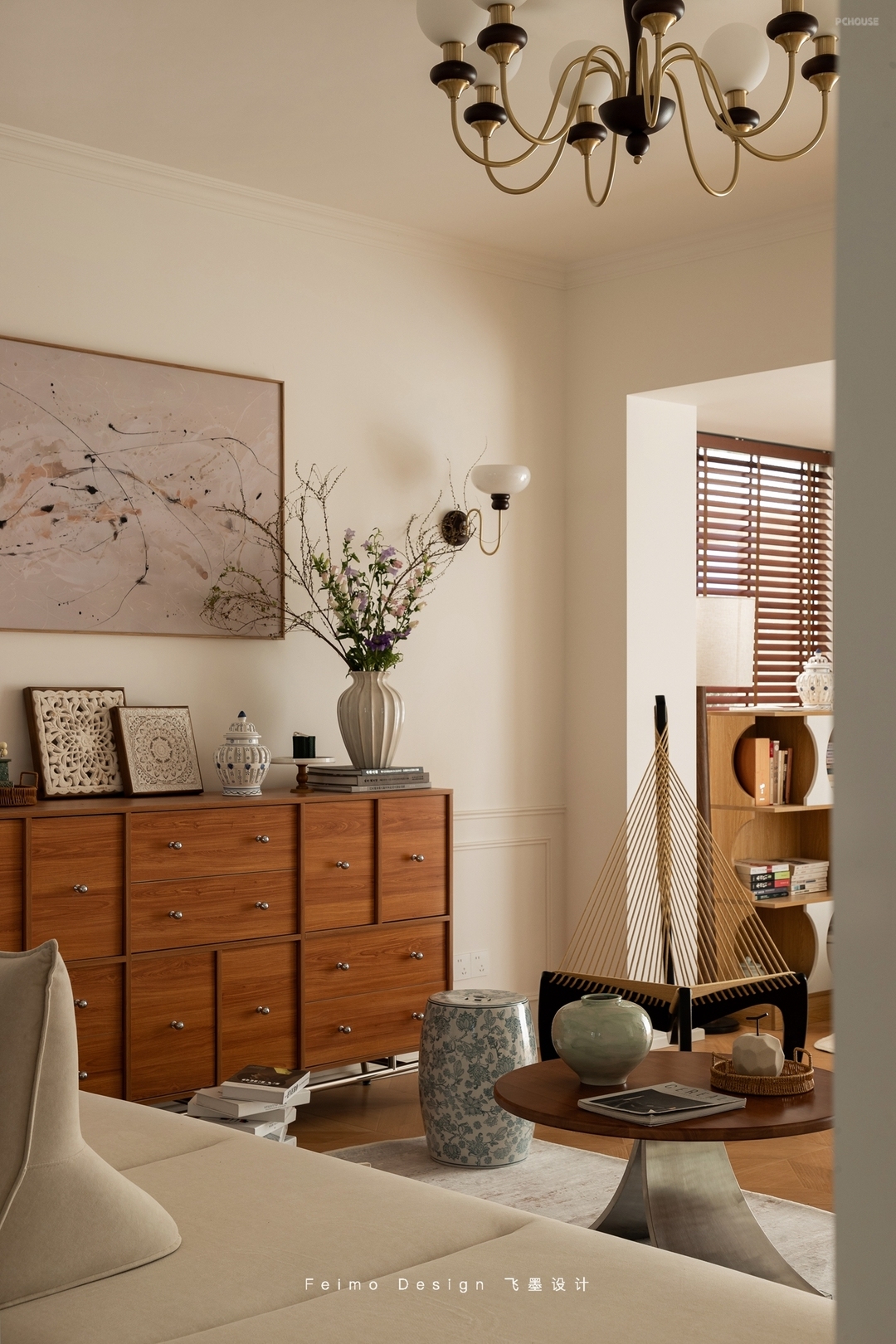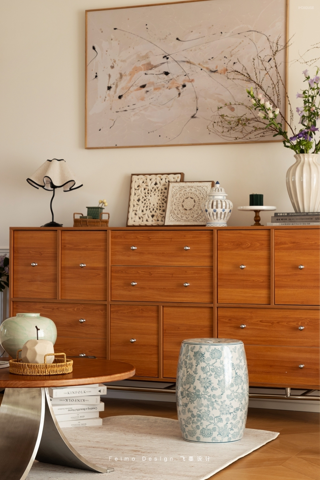 客厅与阳台打通,足够开阔的空间给客厅布局更多的选择;沙发围合摆放,成全松弛自在的生活;石膏线简约精致,勾勒空间的线条感;一张斗柜,一幅挂画,每一件器物,都有自己独属的温度。