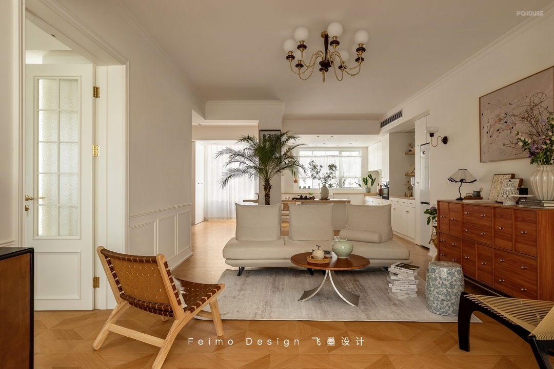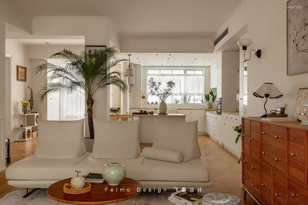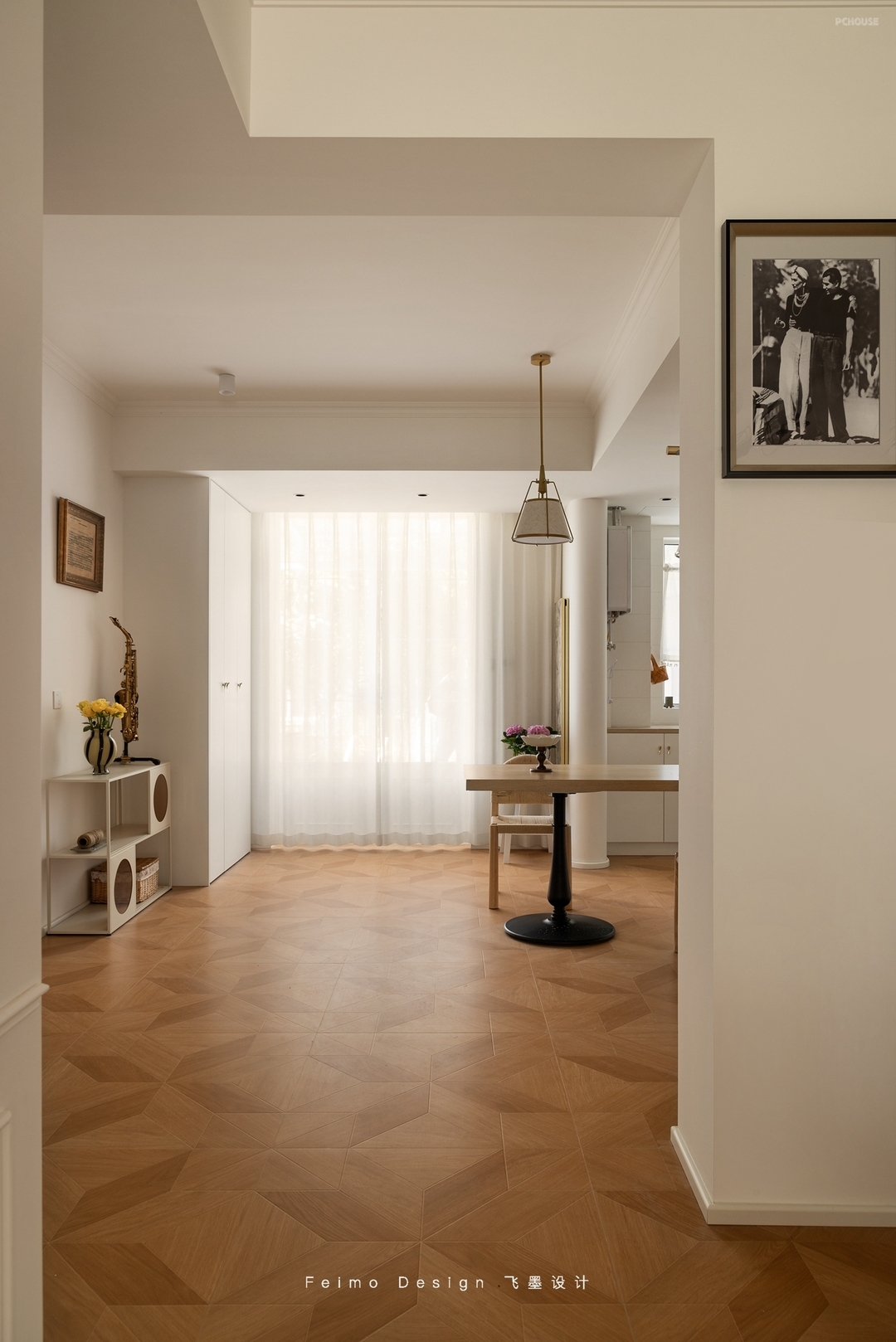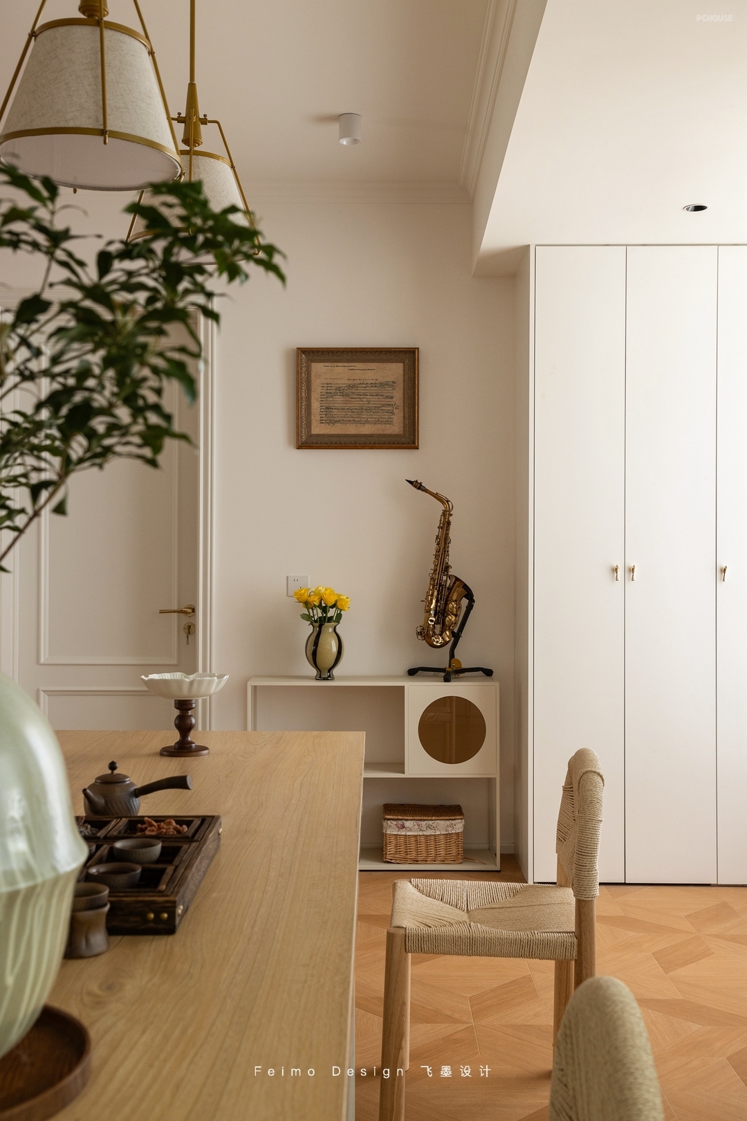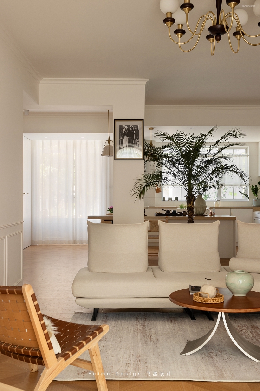 客厅与阳台打通,足够开阔的空间给客厅布局更多的选择;沙发围合摆放,成全松弛自在的生活;石膏线简约精致,勾勒空间的线条感;一张斗柜,一幅挂画,每一件器物,都有自己独属的温度。
