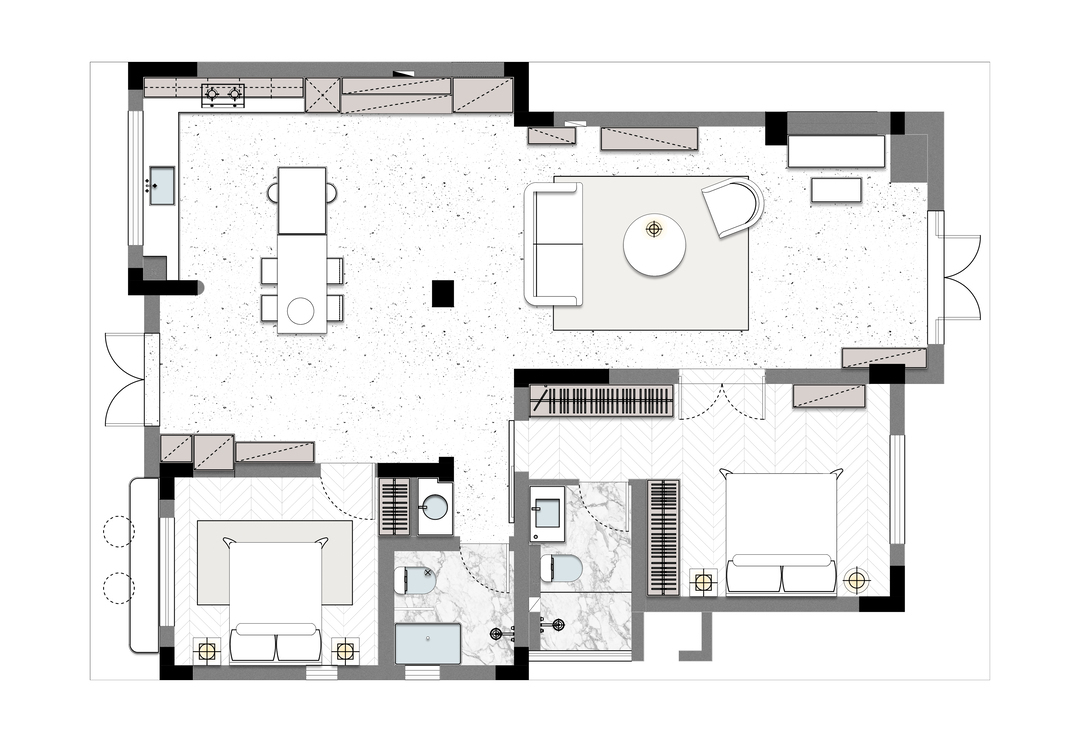原始户型是三室两厅两卫,业主只需要保留一间主卧一间客房,其余的空间全都可以用来成全家居的舒适度。