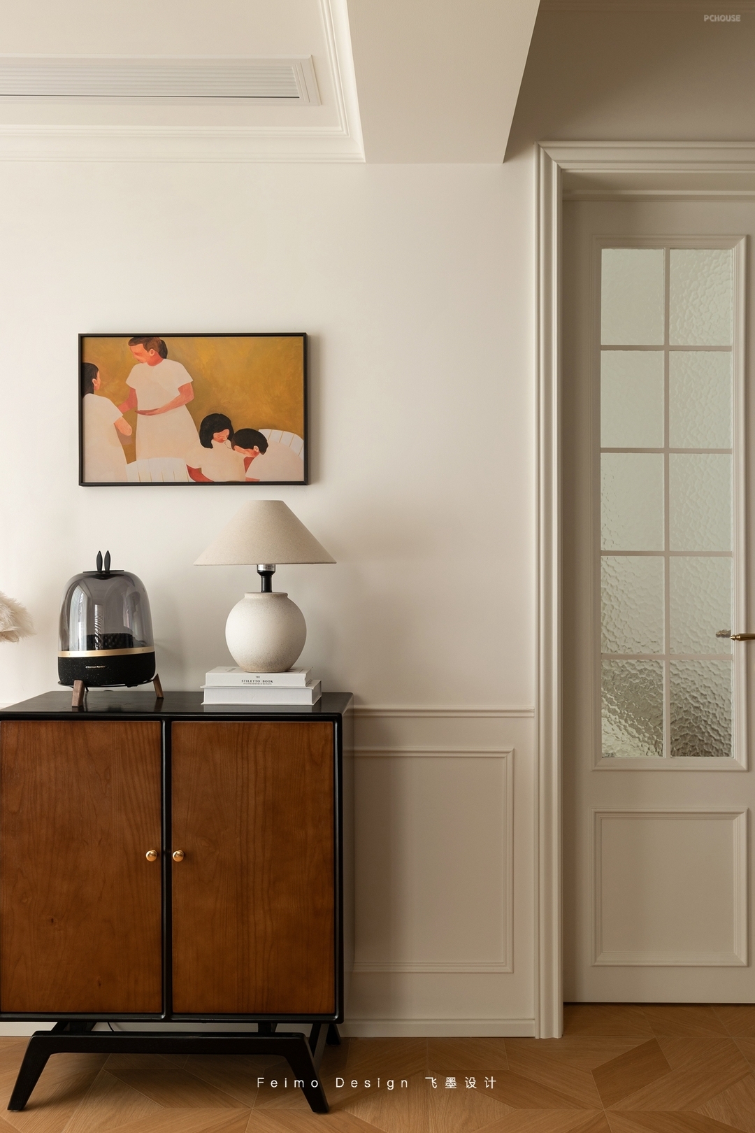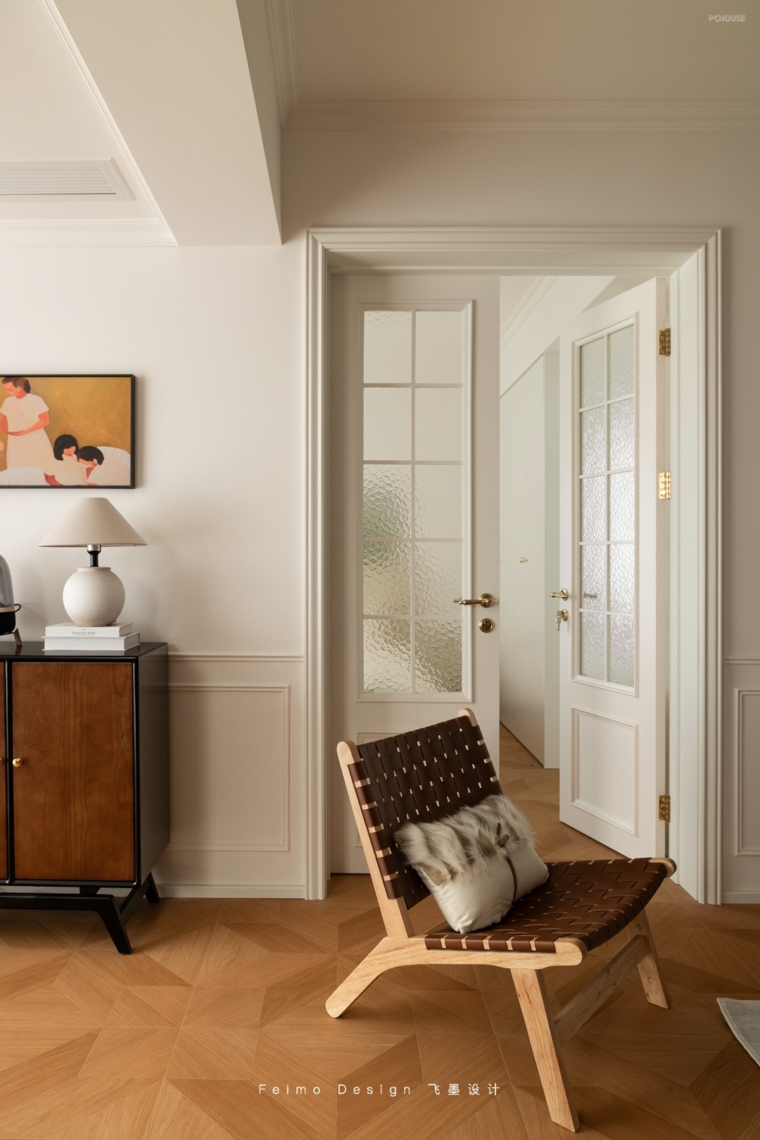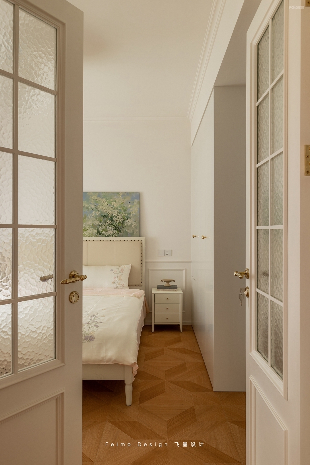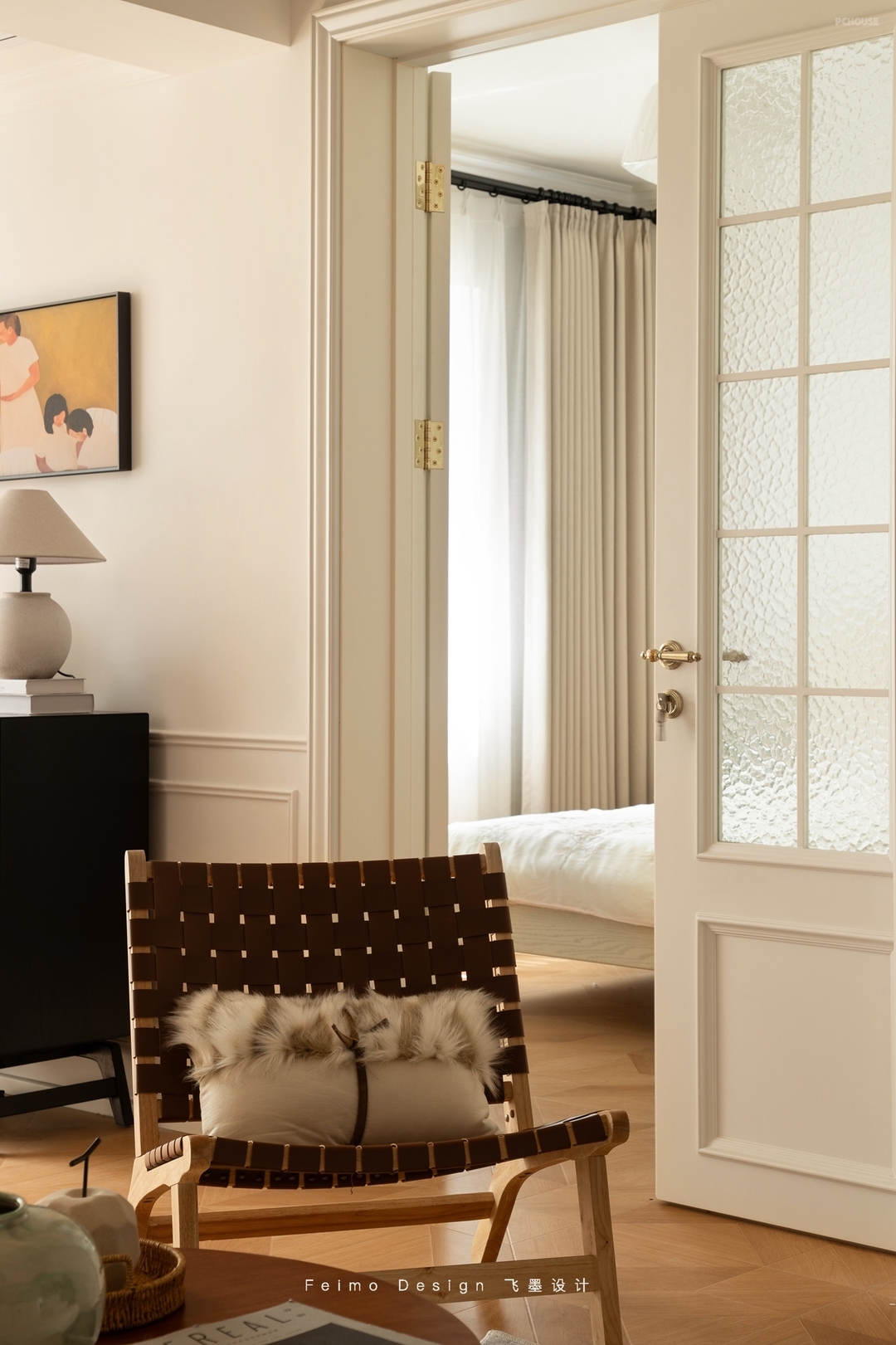 客厅的双开门通往主卧, 奶油白与水波纹玻璃碰撞出法式的独特浪漫;主卧配色依然延续空间的奶油基调,搭配合适的软装配饰,温柔每一夜的好梦。