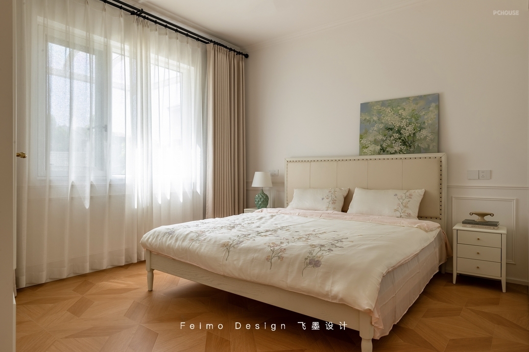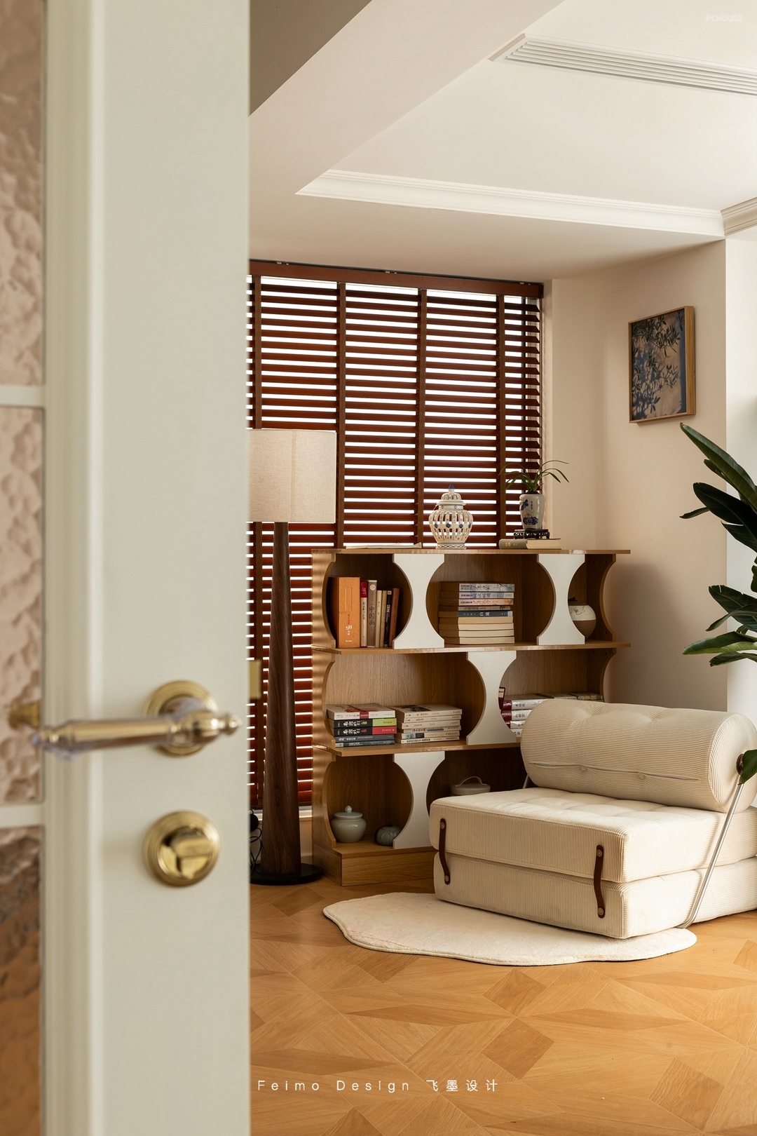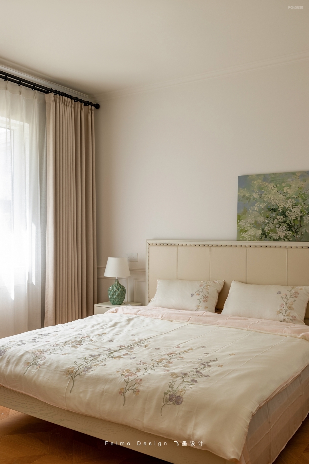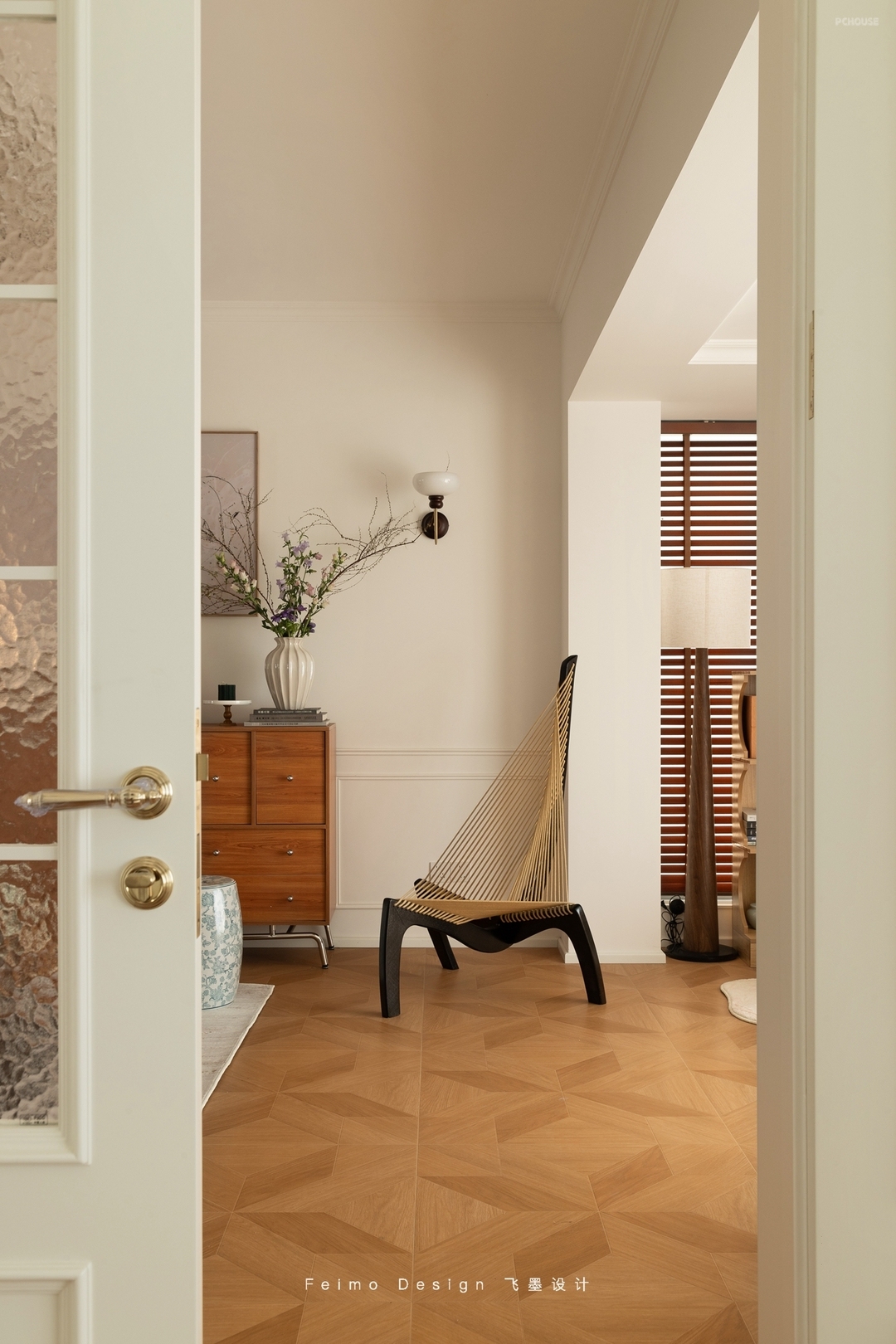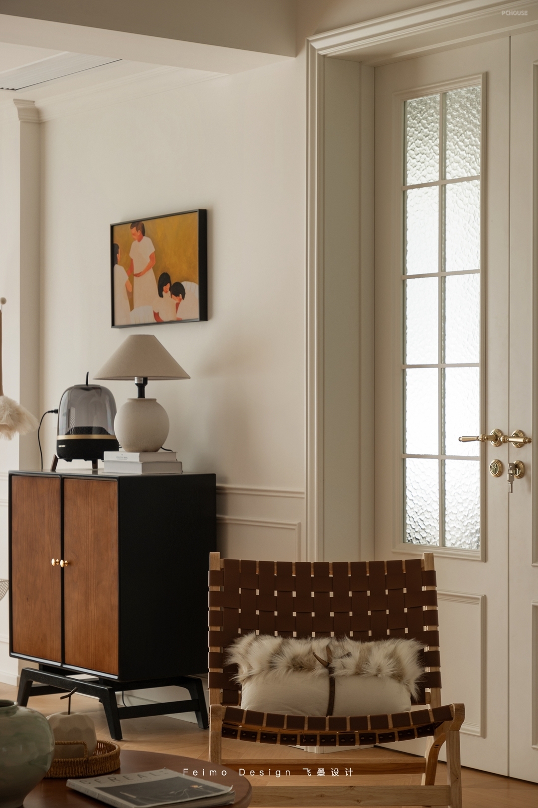 客厅的双开门通往主卧, 奶油白与水波纹玻璃碰撞出法式的独特浪漫;主卧配色依然延续空间的奶油基调,搭配合适的软装配饰,温柔每一夜的好梦。