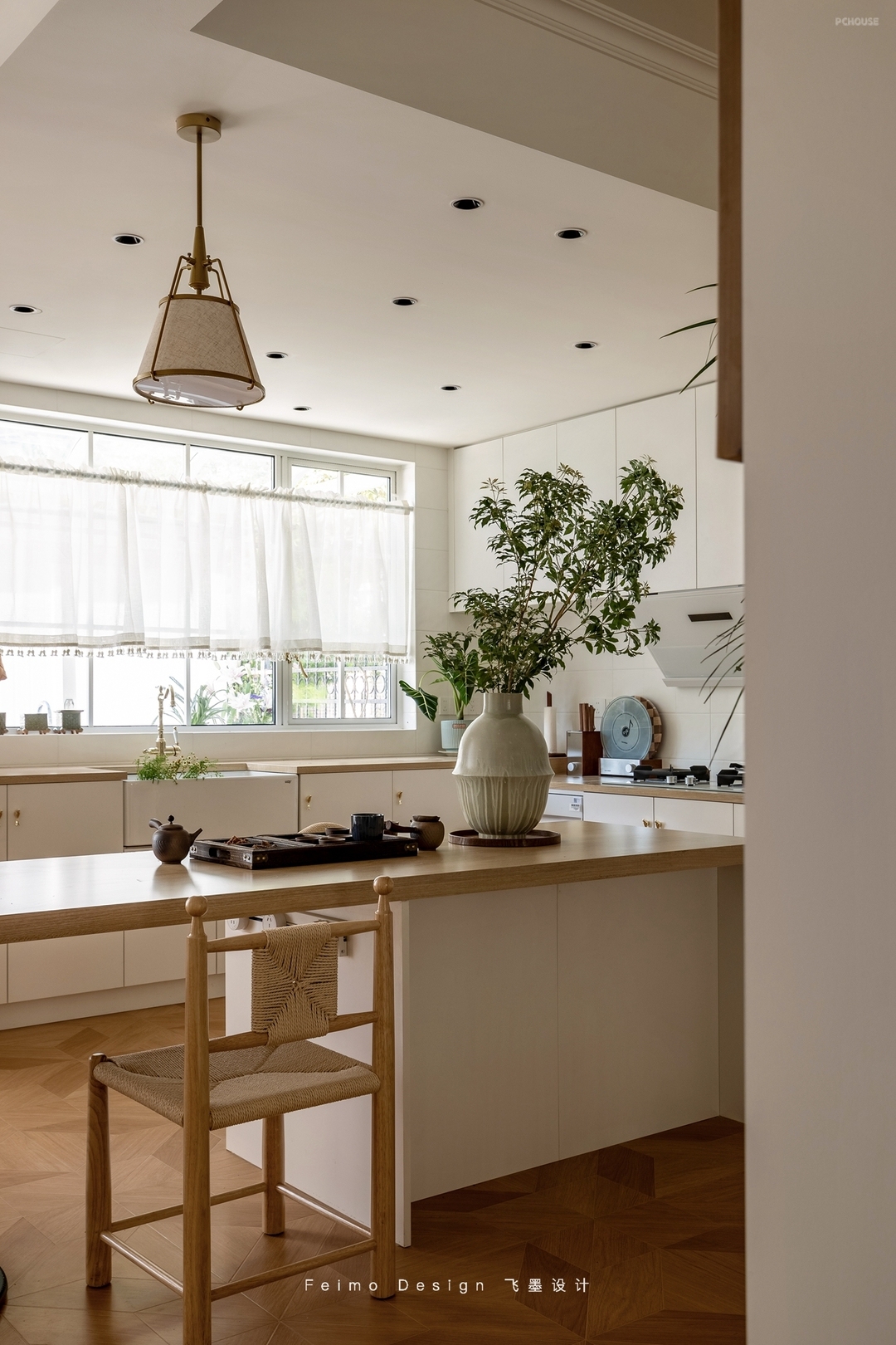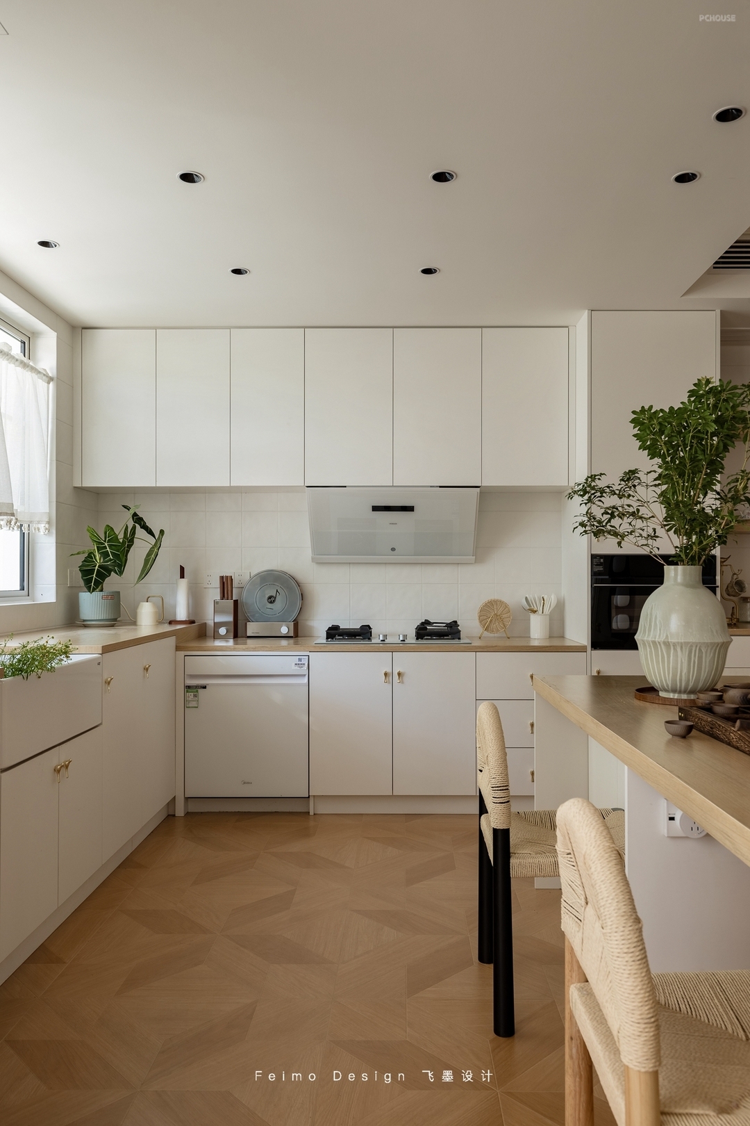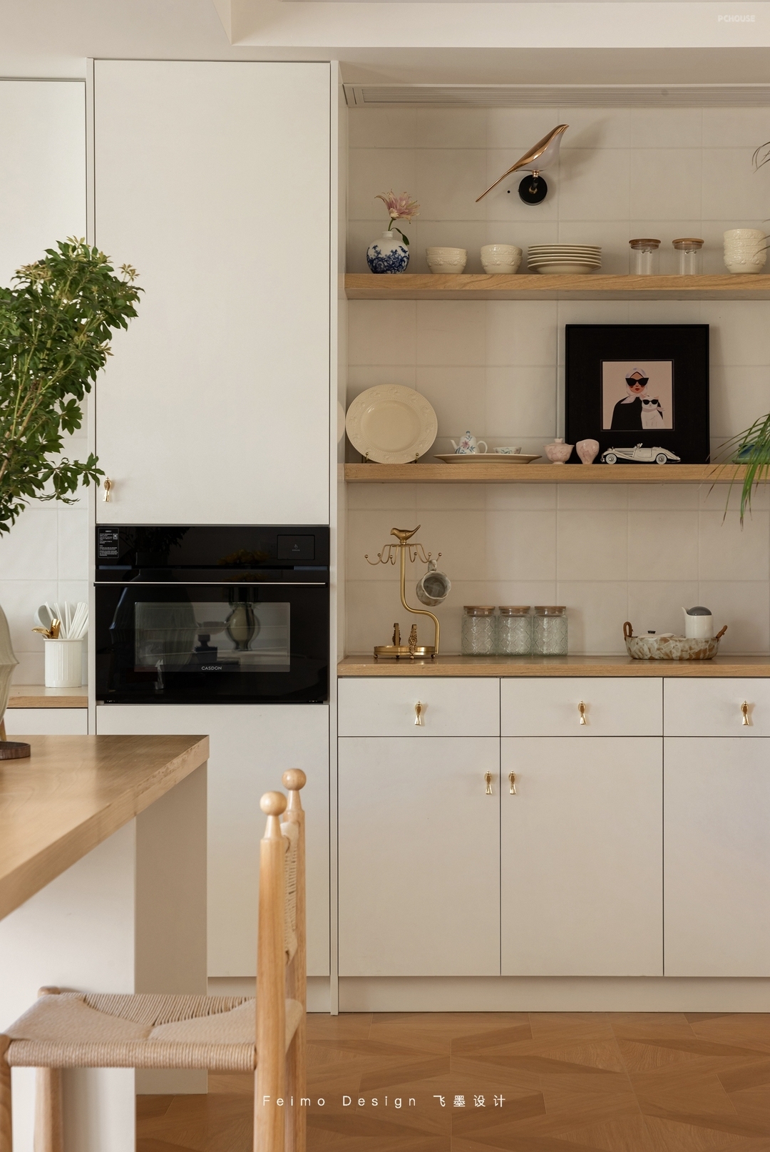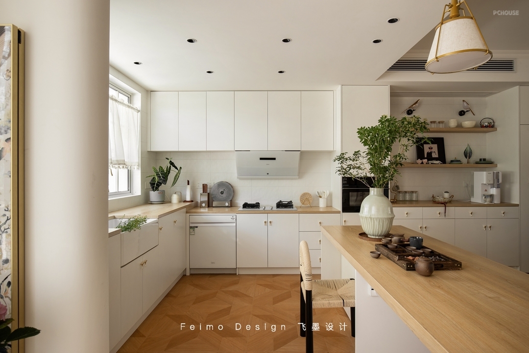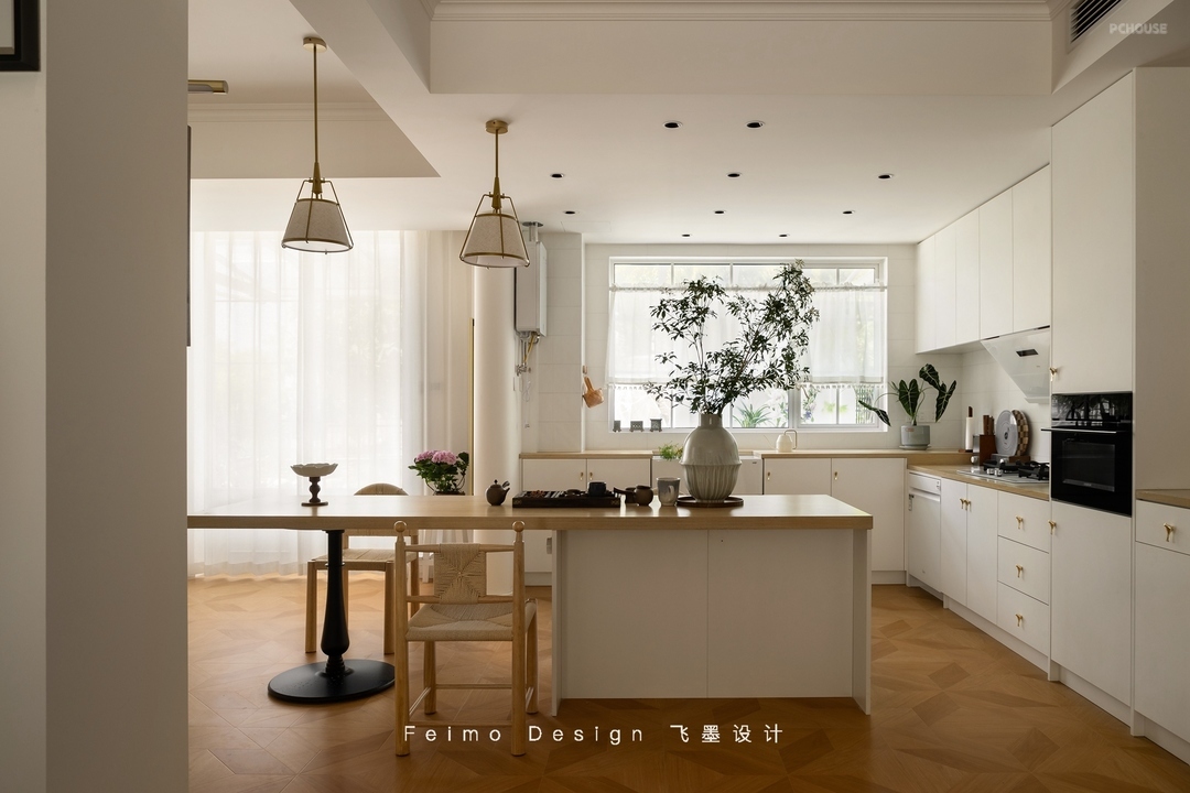 餐厨是全屋改动最大的地方,拆除一间卧室扩容空间,将原始的餐厨打通,实现开放式的布局。
