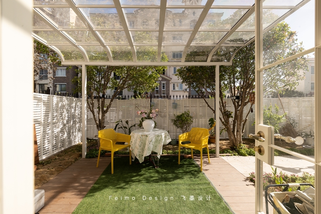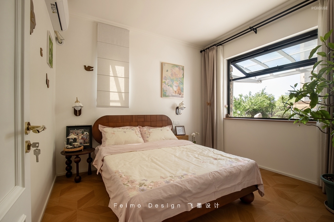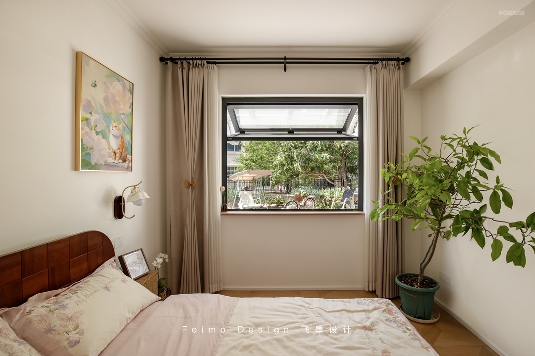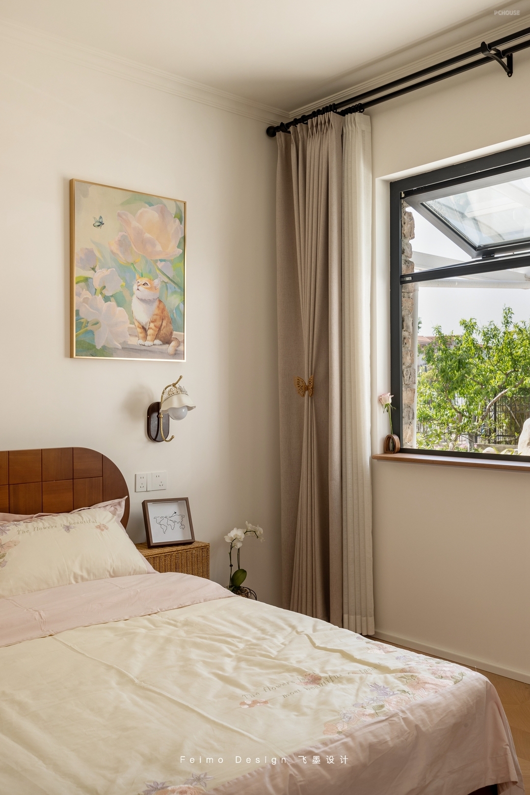次卧是预留的客房,大部分时间都是没有人居住的,所以布局尽量简约处理,一张床,两个床头柜,简单又实用;与院子之间用折叠窗隔断,尽览室外美景。