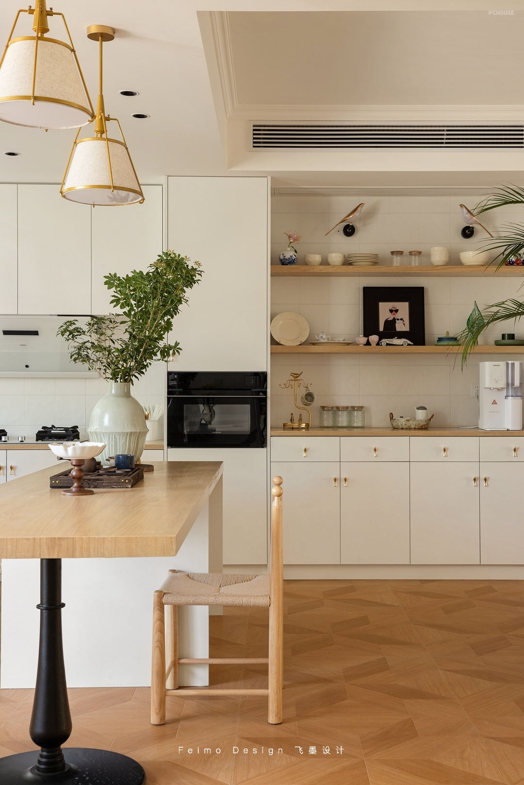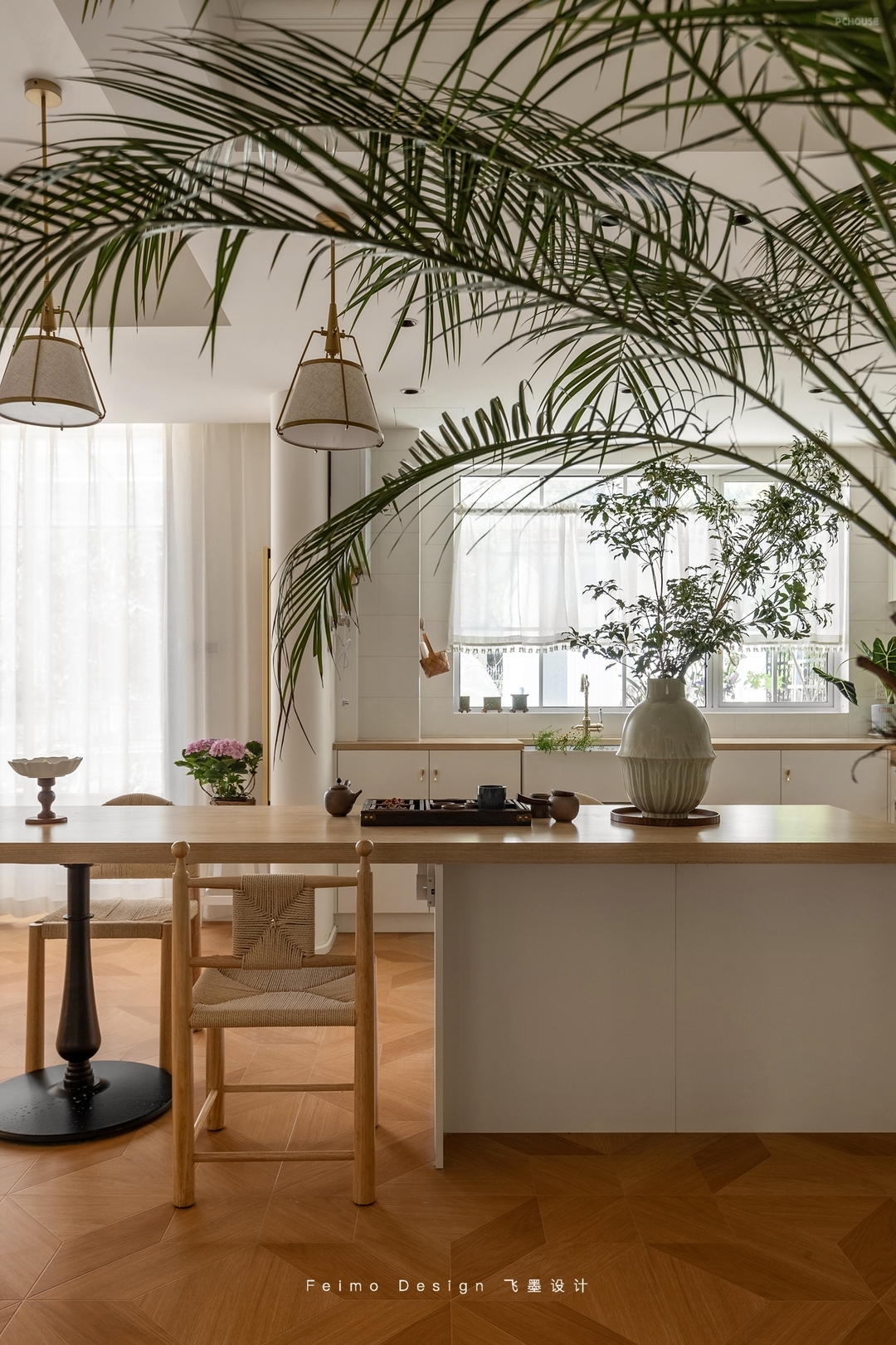 重新规划餐厨空间后,定制橱柜丰满空间的收纳力,L型的柜体满足下厨、餐边柜、零食柜收纳,以及嵌入电器完善空间的动线与整洁度;搭配大长桌,满足所有的生活场景。