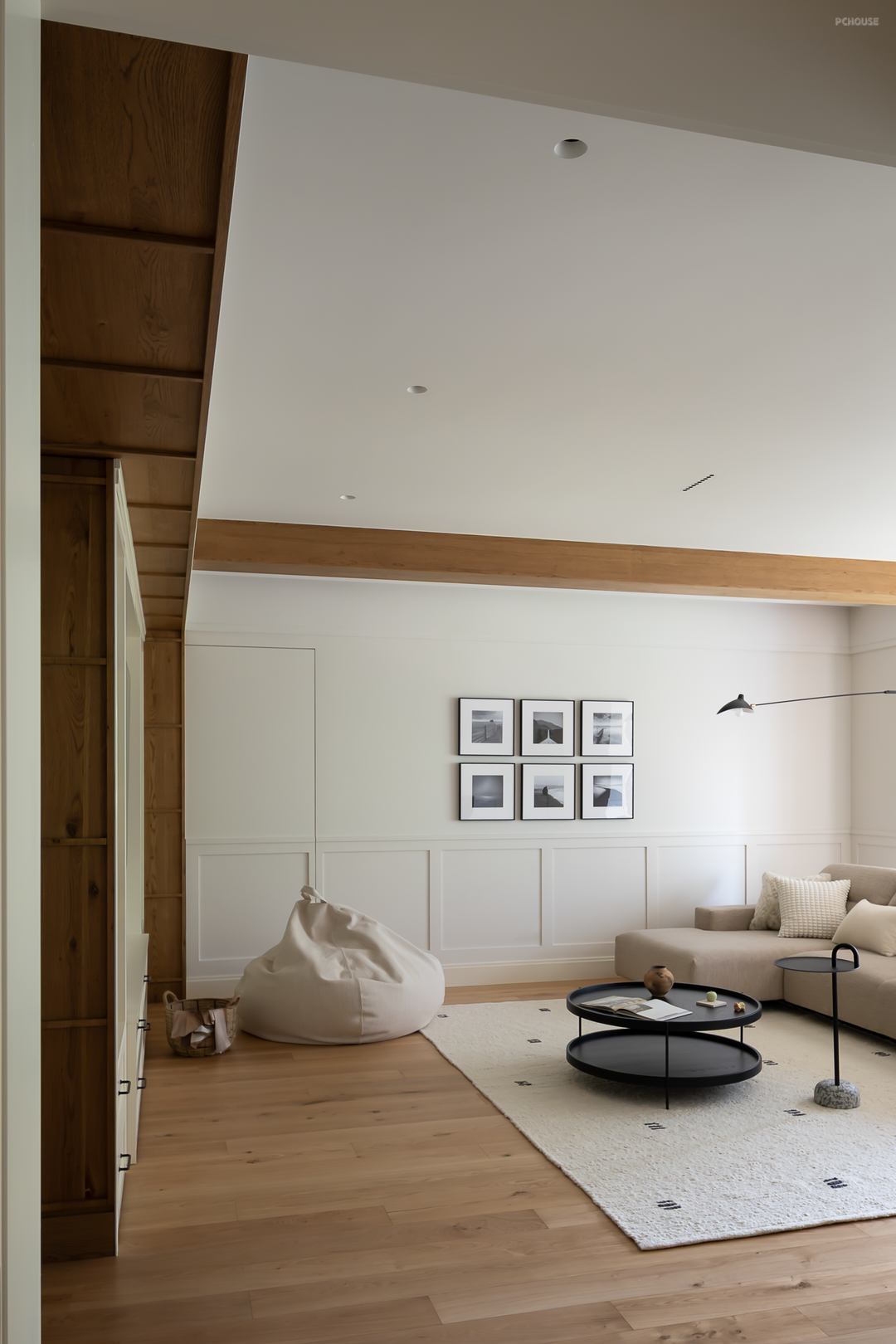 考虑到男屋主从事科技行业,对影音体验有较高需求,电视成为家庭娱乐的重要载体。设计师在沙发背后延伸出一个充满趣味的多功能桌游区——既是朋友聚会时的欢乐据点,也是独处时刻沉浸手游的私享空间。