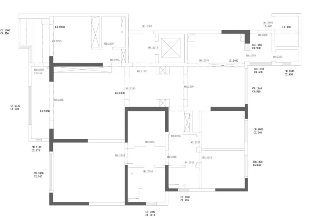 原户型为传统大平层,功能分区明确,却暗藏空间痛点:宽敞处显开阔,狭窄处显局促。走道占面积大,浪费空间。厨房设计封闭,餐厅虽大但不够通透。客厅宽敞却布局失衡,缺乏和谐感。主要通道穿越客厅,隔断沙发与电视区,导致空间零碎、视觉干扰。动线不佳,影响居住舒适感。
