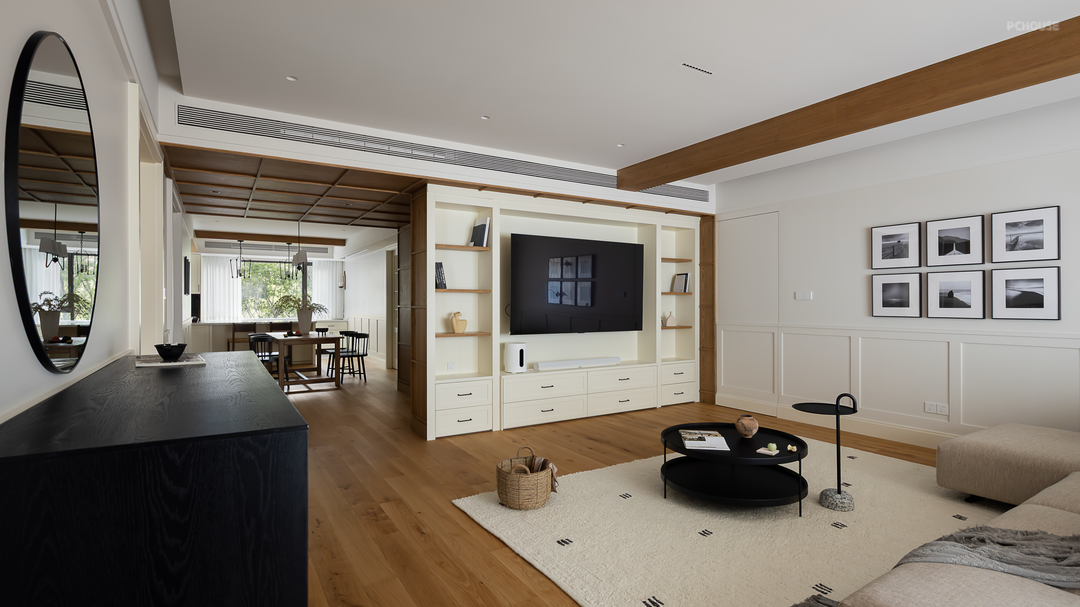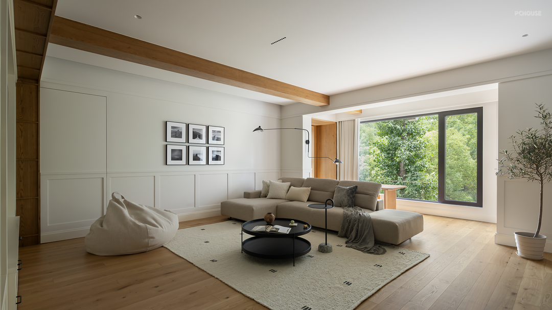 为了平衡凹阳台带来的空间感,右区设计了一款悬浮式卡座,其独特的框镜造型不仅增添了空间层次感,还让凹阳台部分呈现出一种外凸的视觉效果。客厅与阳台的交界处加入了一个假梁设计,巧妙地将两个空间串联起来。这个假梁不仅从视觉上弱化了阳台与客厅的分隔感,还增添了一份美式自然风的韵味。