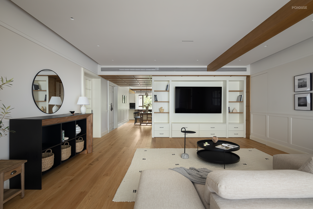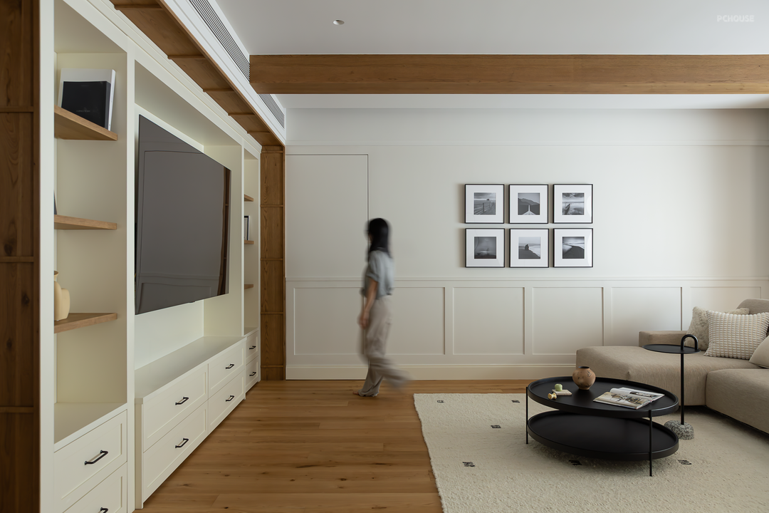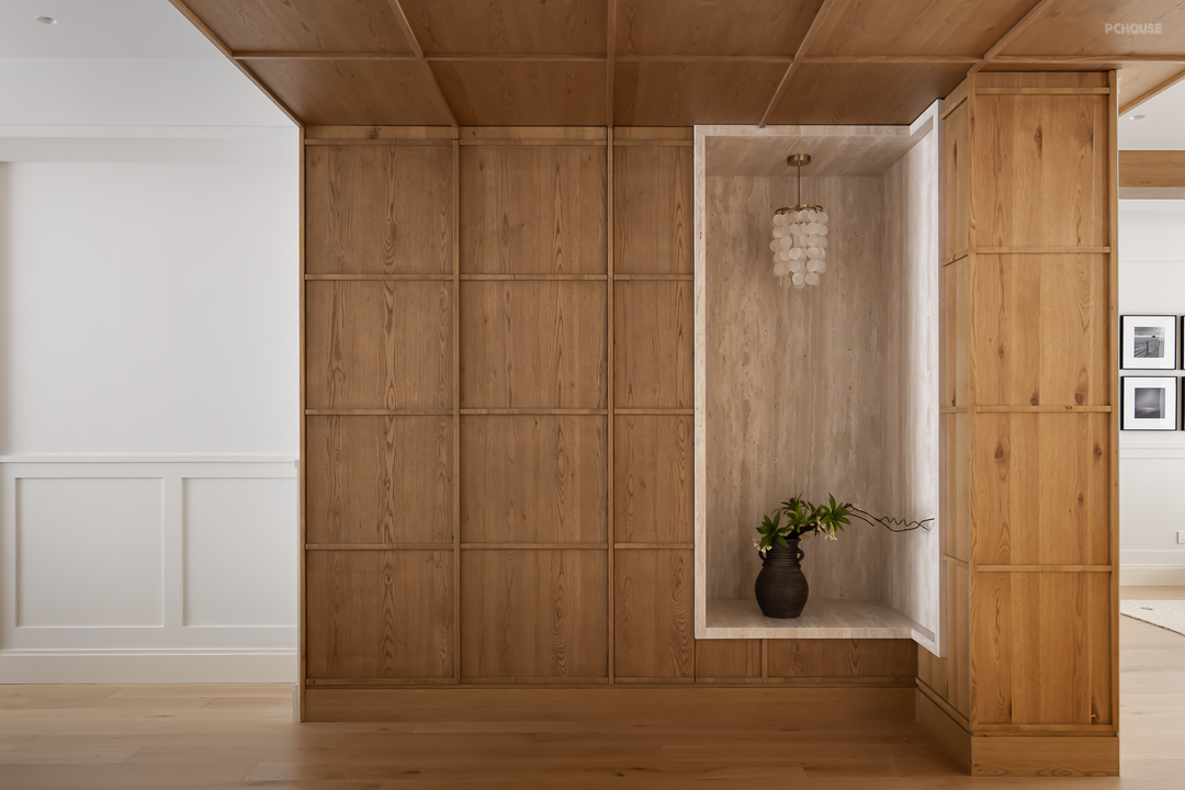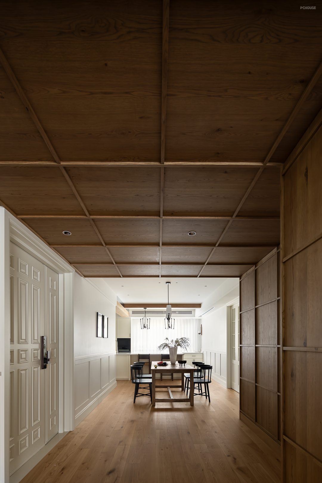 设计师遵循:“让大宅不止于大,而更贴近用”的设计理念,将原户型中那些被忽视的过渡区域:过长的走道、空旷却低效的玄关等重新利用并赋予新的功能与美感。