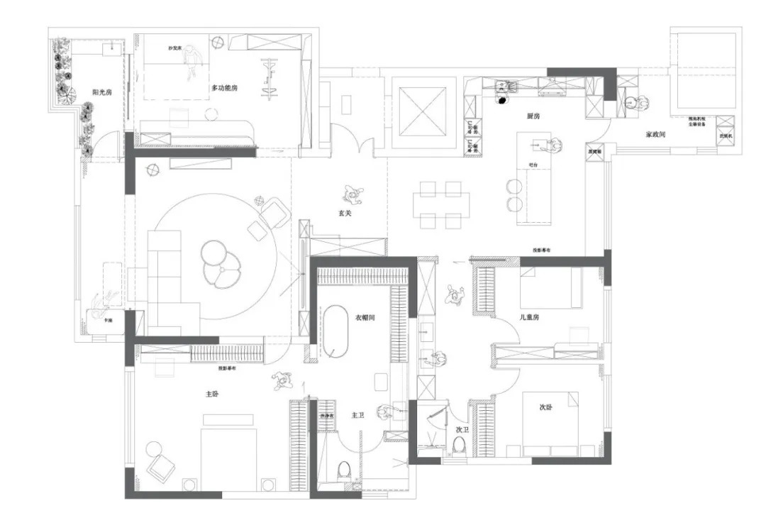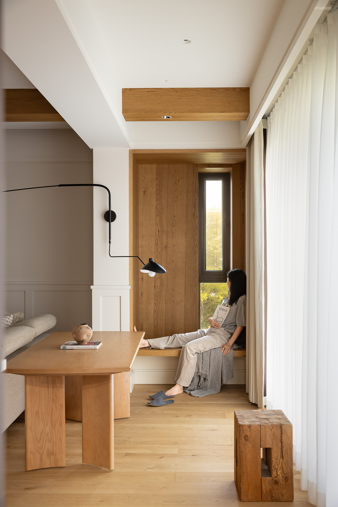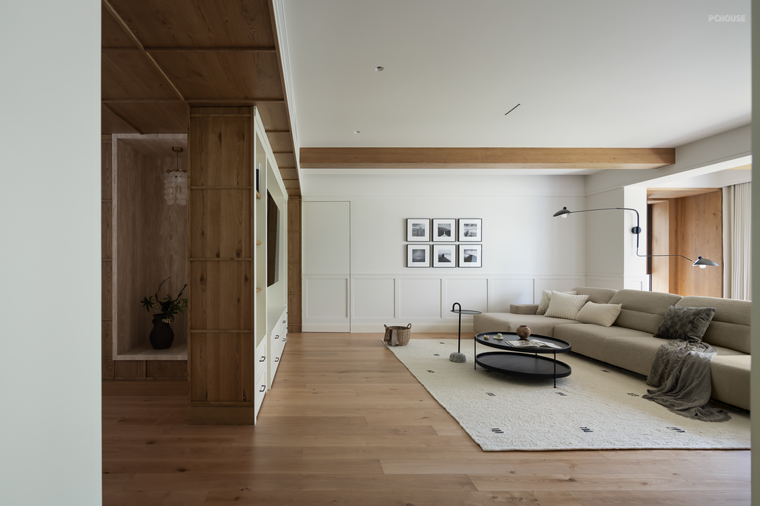 设计师遵循:“让大宅不止于大,而更贴近用”的设计理念,将原户型中那些被忽视的过渡区域:过长的走道、空旷却低效的玄关等重新利用并赋予新的功能与美感。