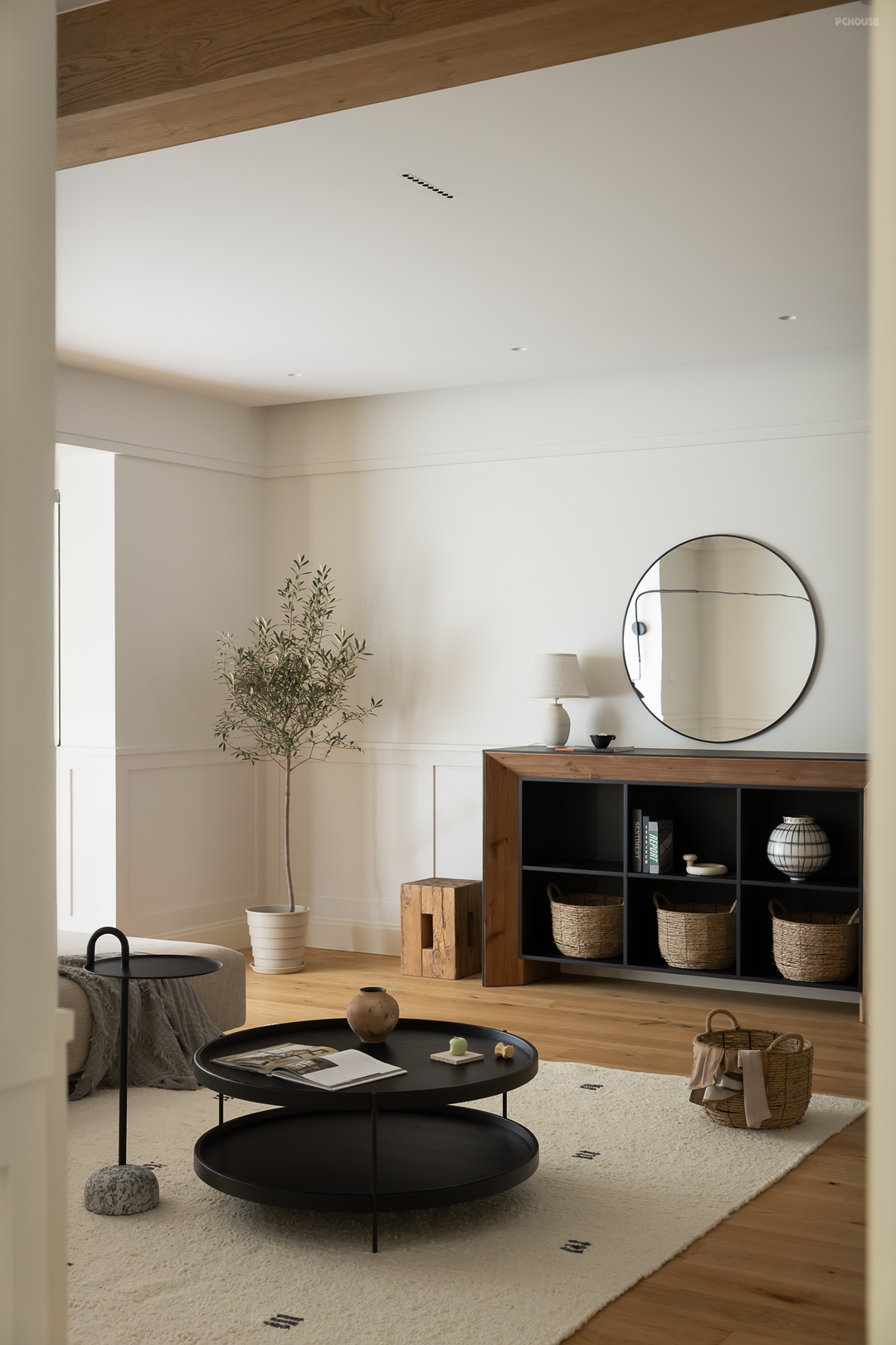 设计师重新梳理空间逻辑:压缩无效走道,释放更多实用面积;打通厨餐区,构建开放、互动的社交中心;调整客厅布局,弱化穿行干扰,重塑空间轴线与视觉重心。