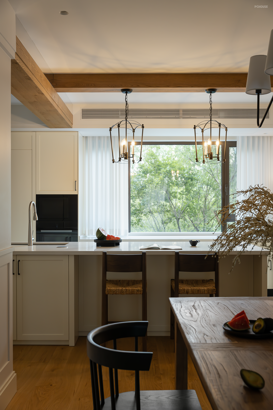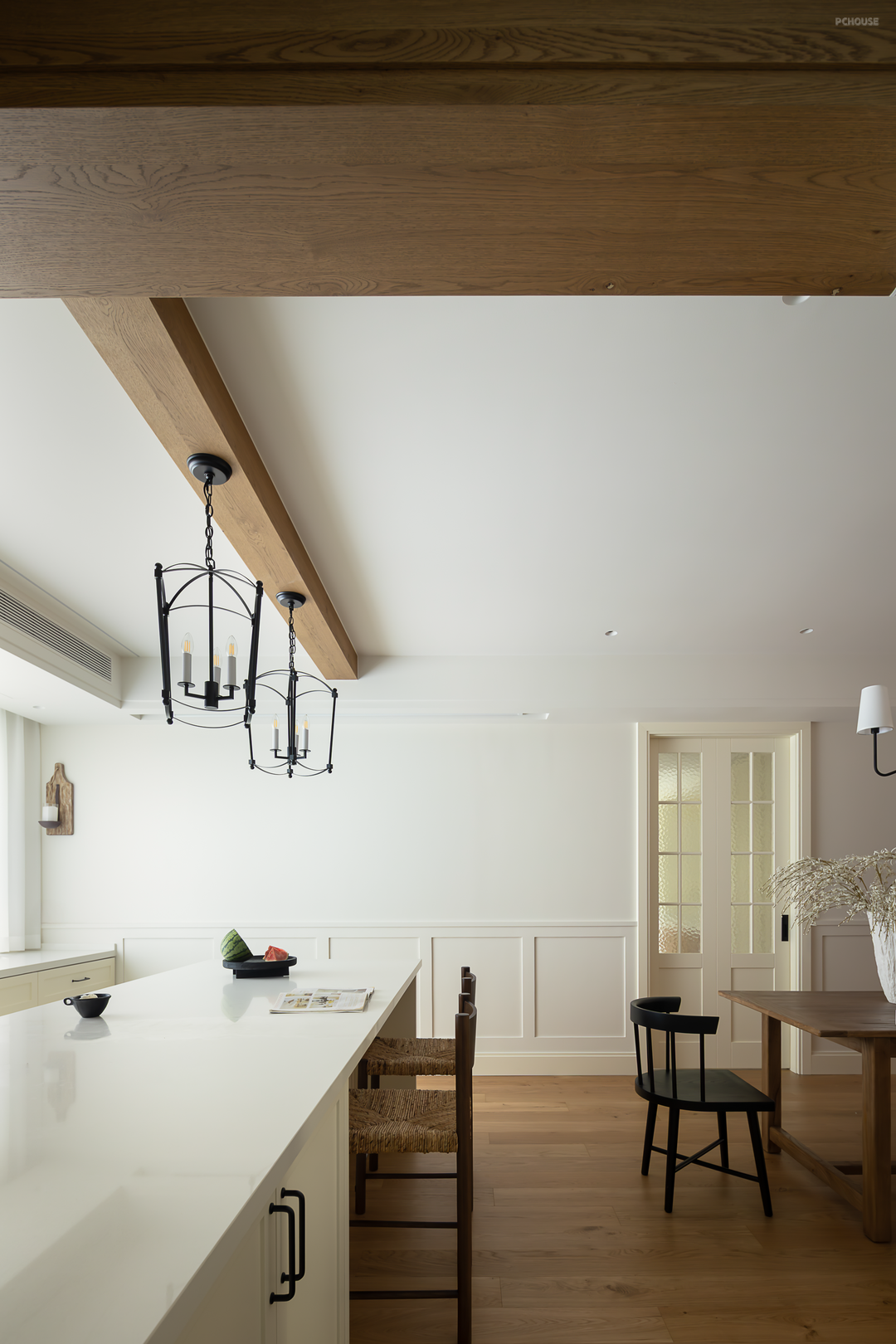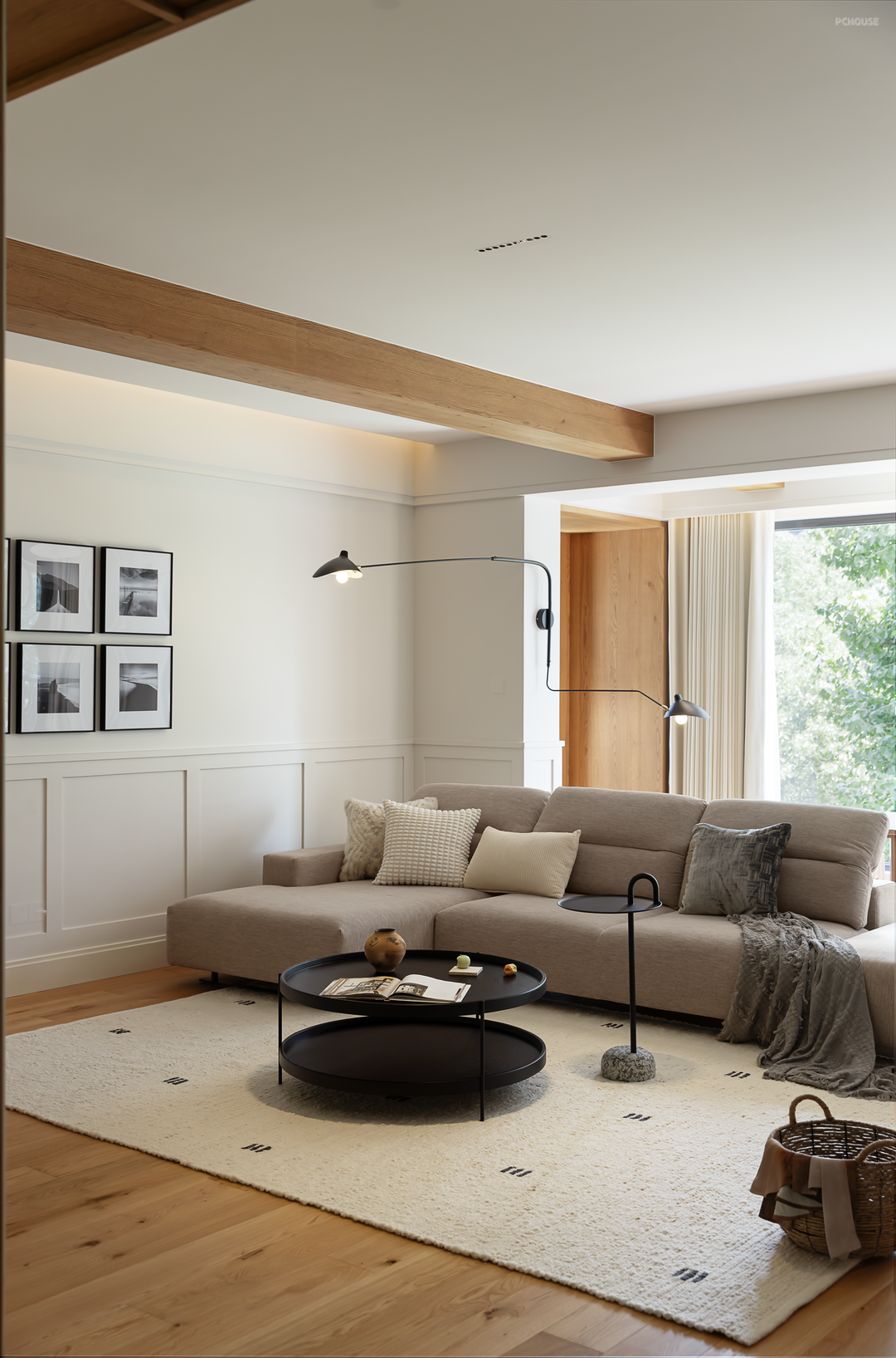 本案,位于中海紫御豪庭,250㎡精装大宅,屋主是一对年轻夫妻,面对原精装交付中浓厚的奢华法式风格,他们更向往一种回归本真的生活状态:原木的温润肌理,美式生活的松弛节奏。综合考虑下,设计师进行了全拆改造设计,风格转向美式自然主义——不刻意、不张扬,用材质的本真与光影的流动,营造温暖惬意的氛围。