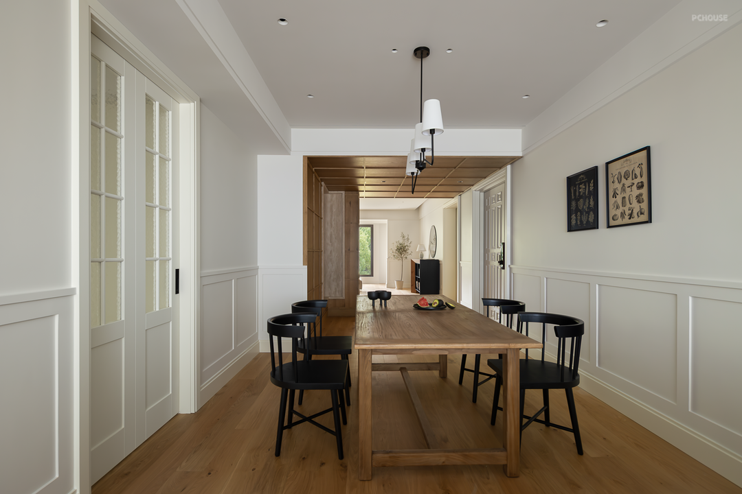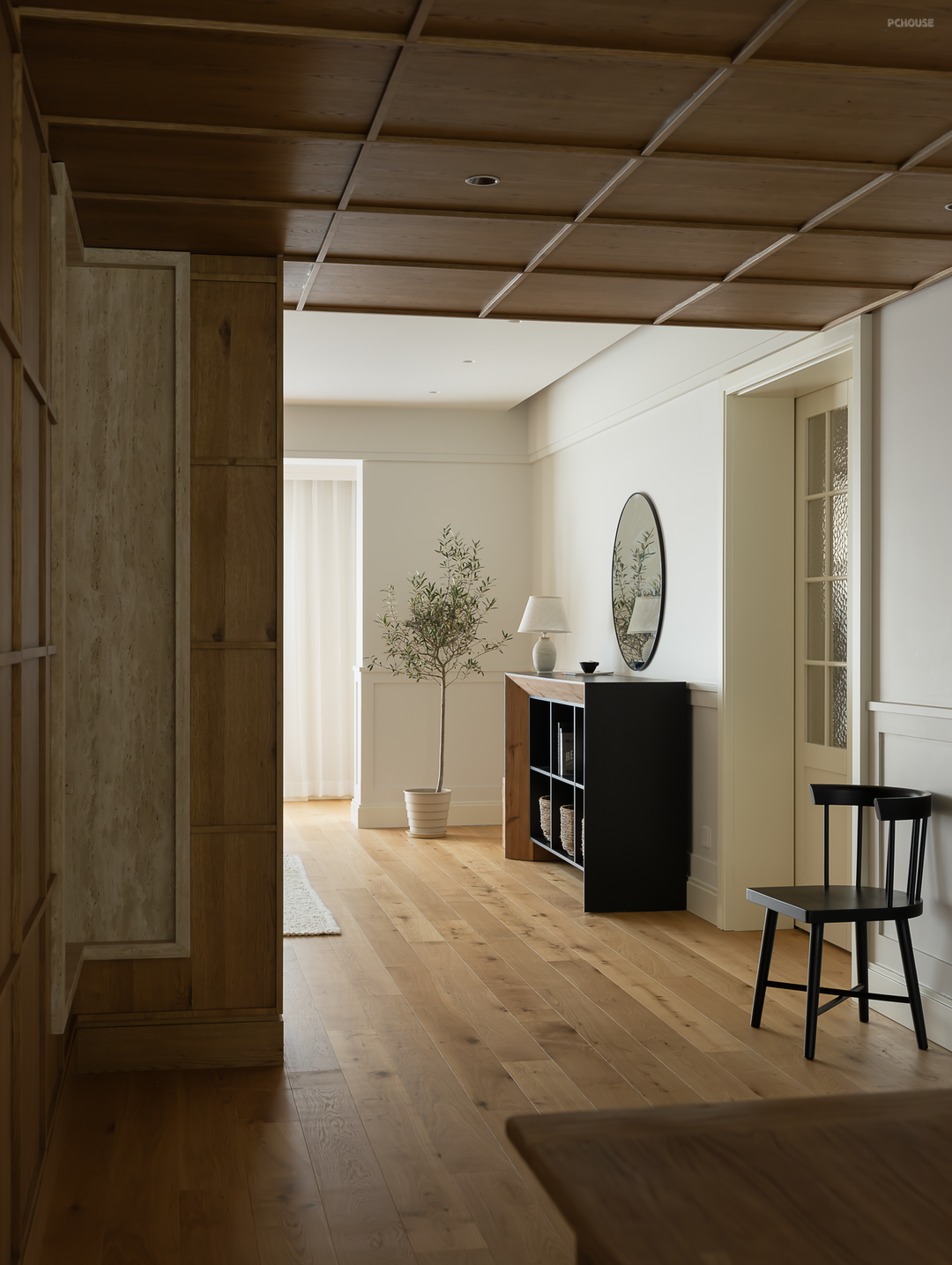 原入户玄关过于宽敞,有些浪费空间。设计师将其适度收窄,释放空间给到了餐厅区域,有效拓展了用餐空间的舒适性与尺度感。