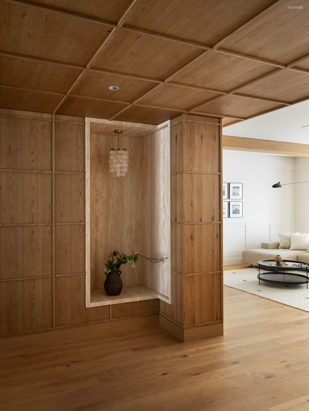 玄关,设计师摒弃了纯装饰性的设计,转而注重实用性与美观性的结合。入户设计了一整排柜子,既方便收纳外套等物品,又在柜子内部巧妙地设计了一个壁龛,用于展示装饰物品。美式田园风格的吊灯和自然元素的洞石材质,成为了视觉焦点。这里不仅仅是归家的仪式感,也是承载记忆、表达审美的生活切口。