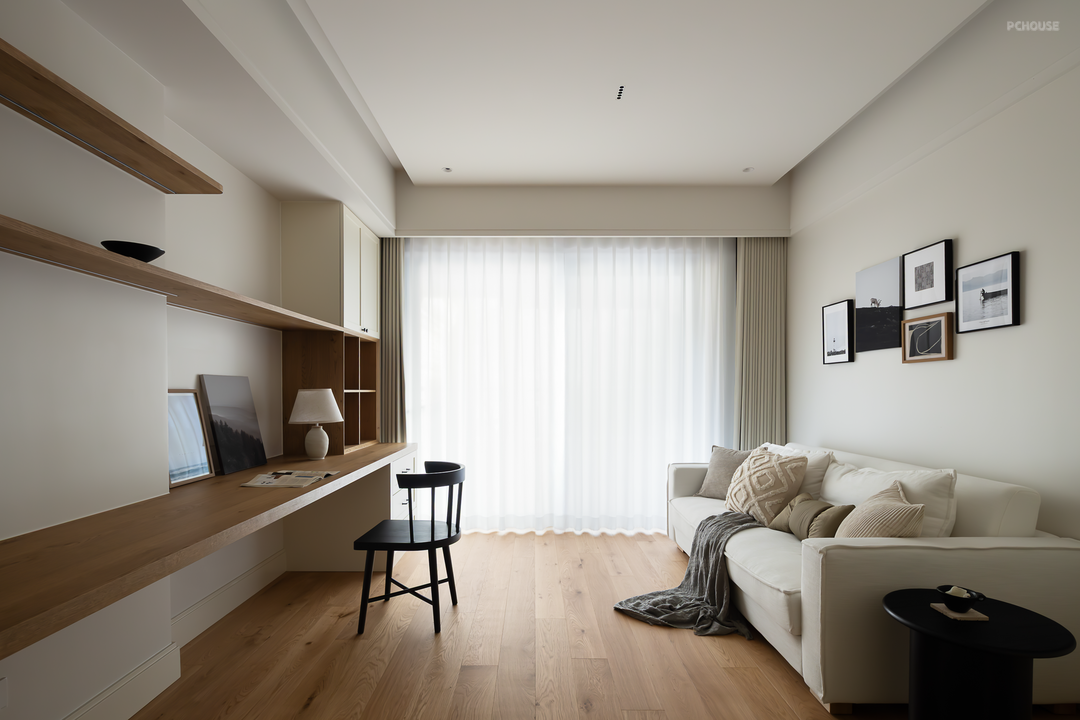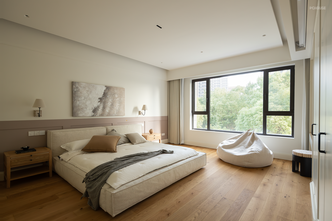 考虑到男女主人都有在家办公的需求,且办公时间可能存在重叠,主卧内特别设置了一个小书桌。这样,即便他们同时开电话会议,也不会相互干扰,确保了各自的工作效率和隐私。