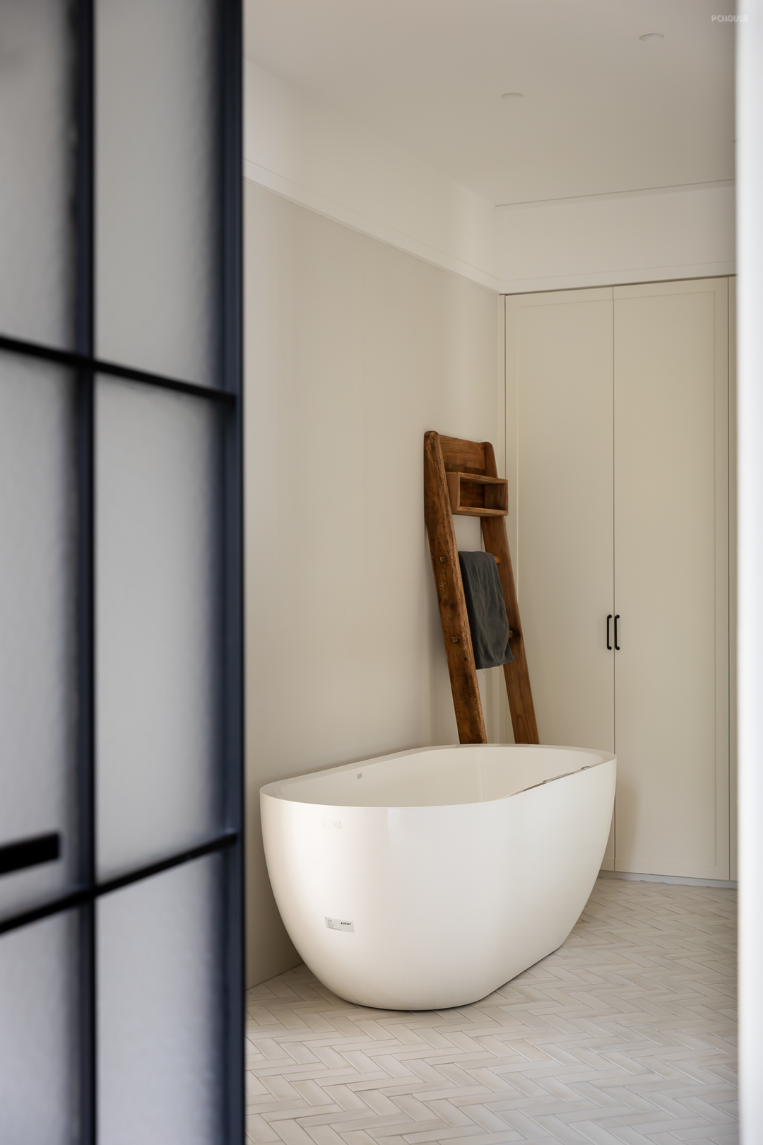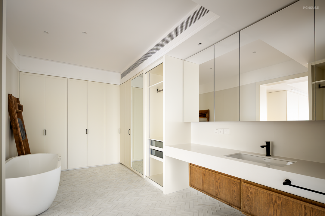 设计师打破传统隔阂,将衣帽间与主卫彻底打通,重构为一套高效流畅的三分离设计,动线清晰、互不干扰。浴缸与衣帽间的融合,更是营造了一种极致的享受感,让人在沐浴时也能感受到舒适与惬意。