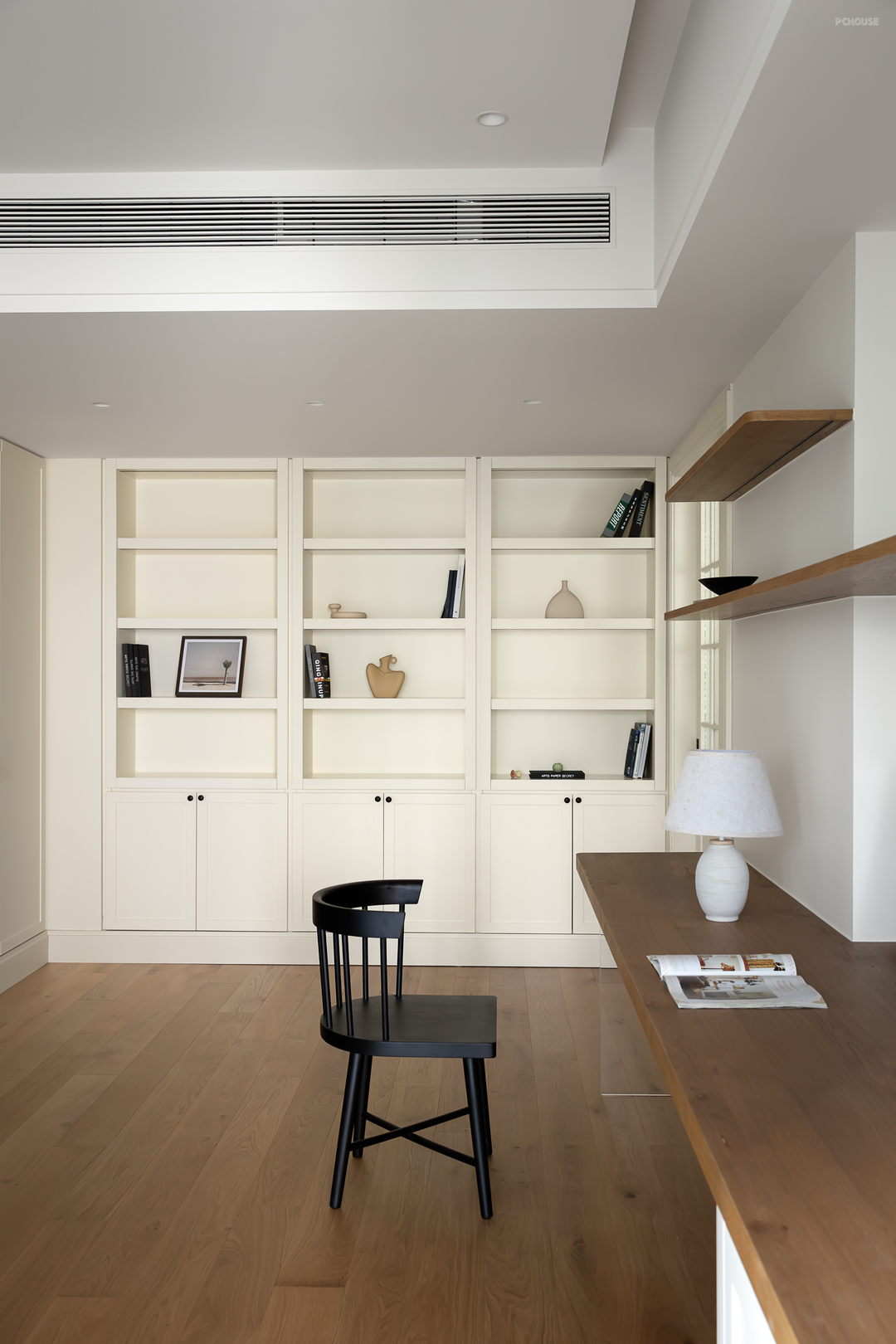为满足男屋主办公需求,书房特设一张大尺度定制书桌稳居核心——结构稳固,台面开阔,足以容纳三屏系统,满足科技工作者对多任务处理的严苛需求。人体工学椅、隐藏式线槽、可调节阅读灯,每一处细节都为长时间专注工作提供支撑。