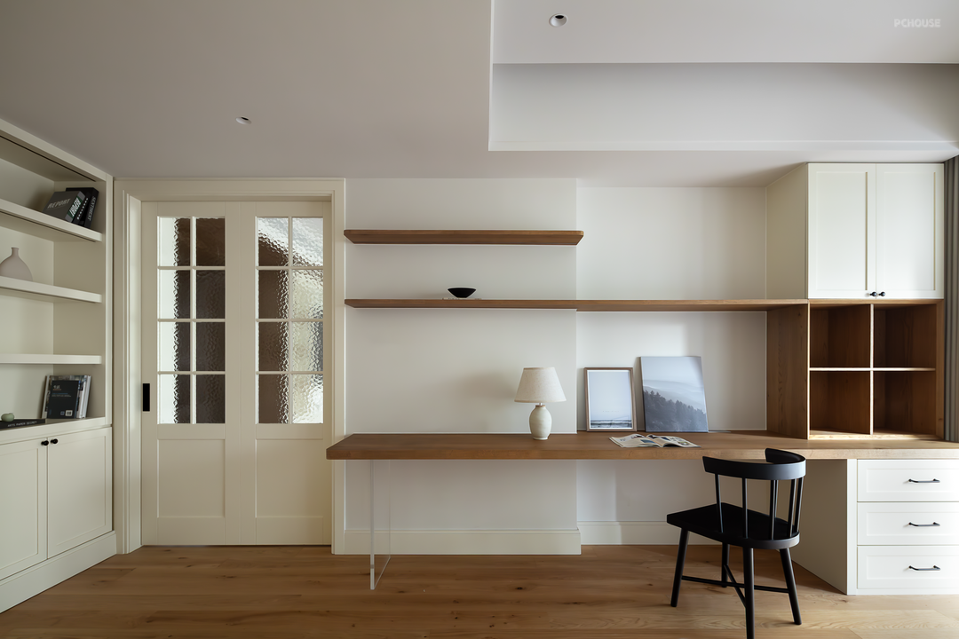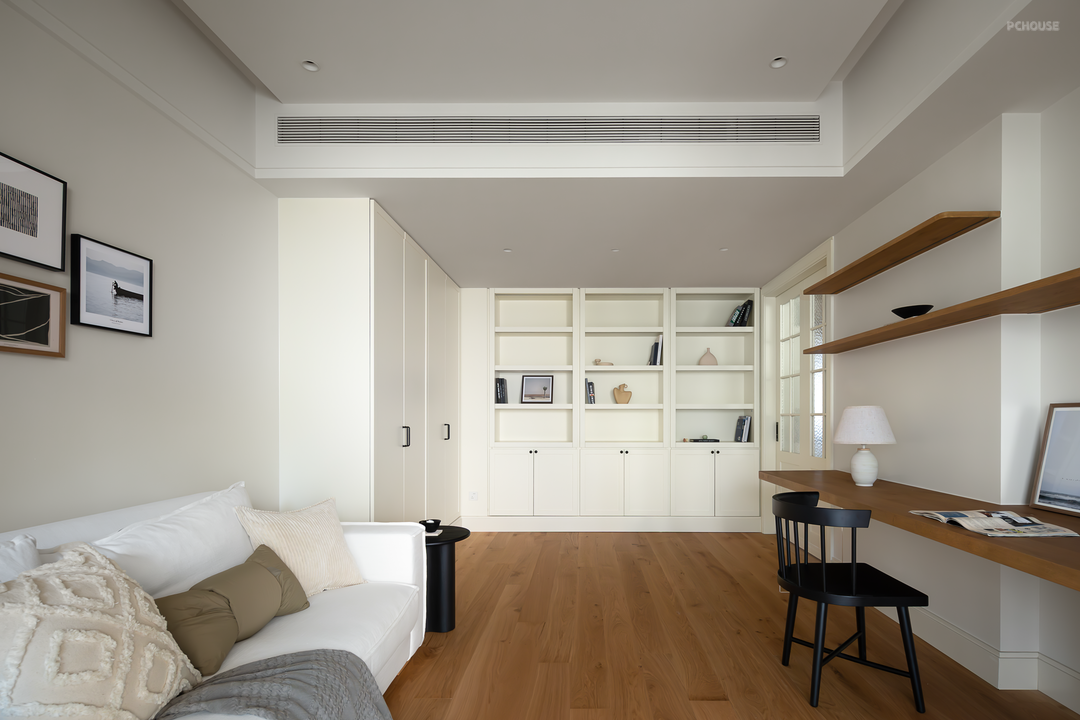 考虑到房子的承重结构限制,设计师将书房非承重结构全部拆除,将原封闭书房蜕变为一个半开放式多功能空间。既保留了独立区域所需的宁静与私密感,又通过开放界面,实现与公共区域的视觉互动与空气流动,让空间更显通透轻盈。