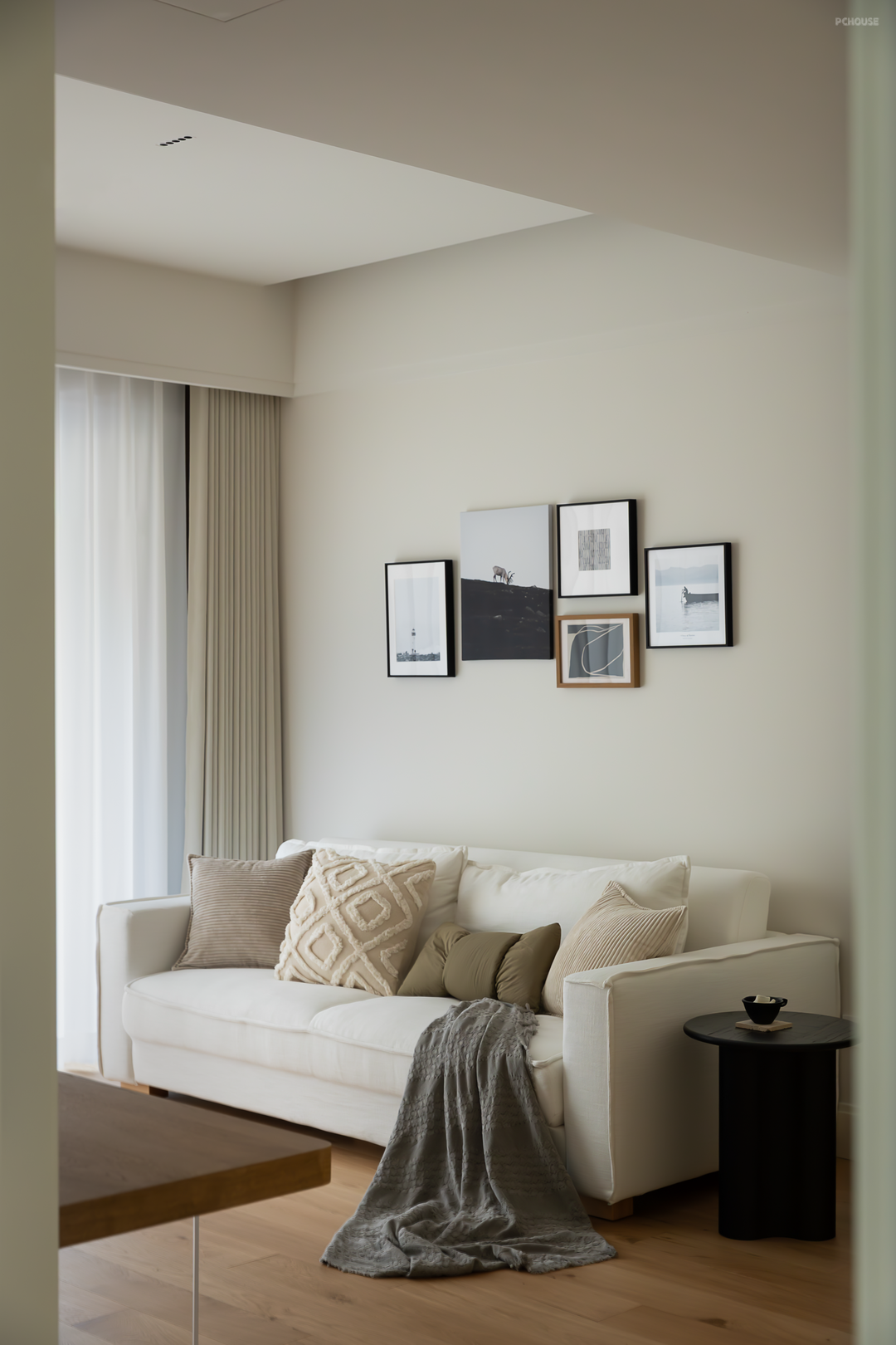 阳台打通后与客厅并融为一体,扩大了客厅的空间感,增添了一份通透与敞亮。为了让空间布局更加合理,设计师将电视机的位置旋转至北面,形成了一个半围合的观影区,有效屏蔽了走道的穿行干扰。