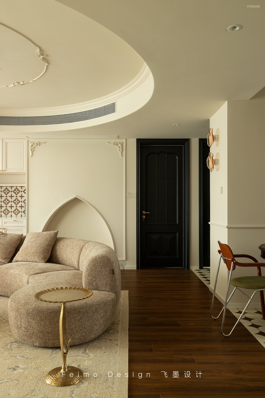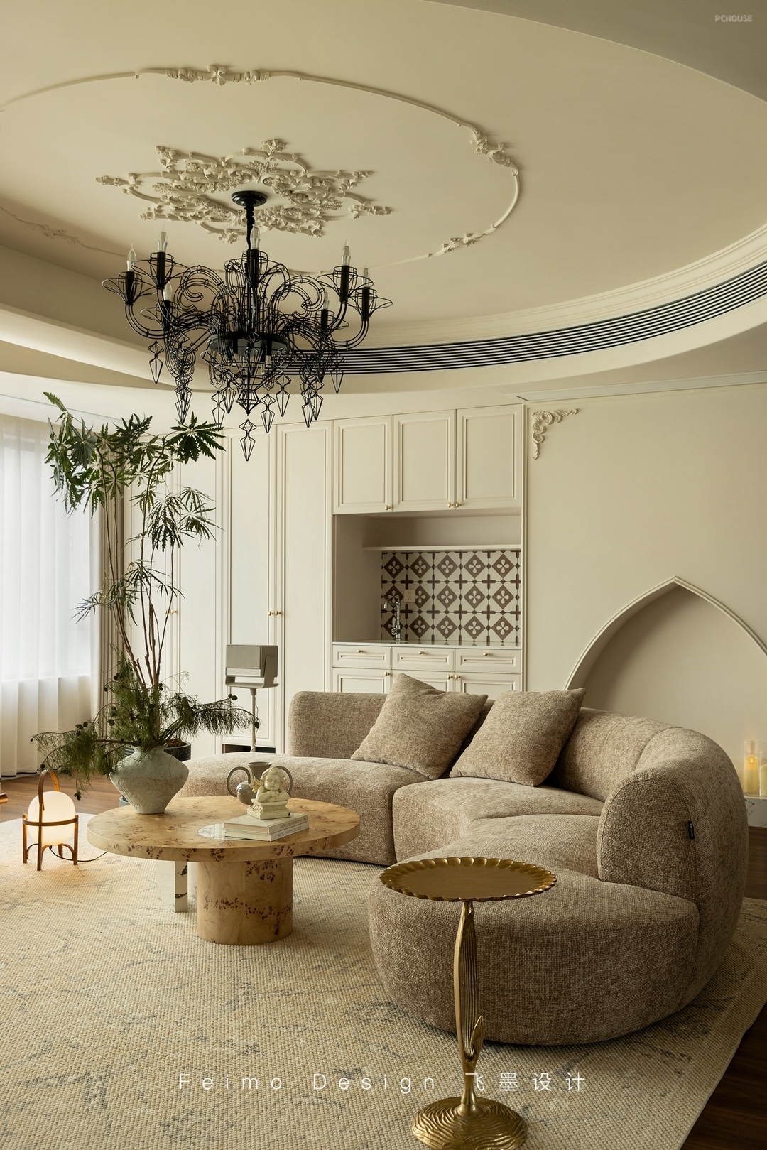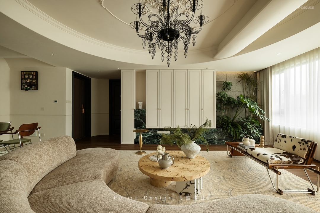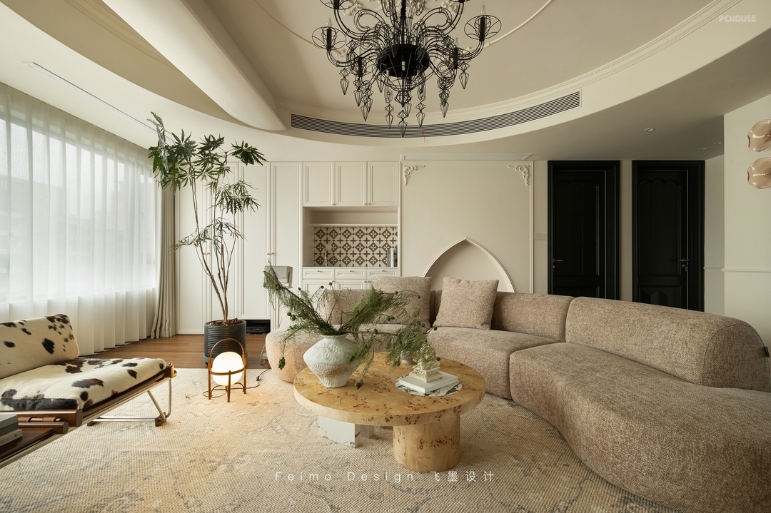 圆弧的异形吊顶包裹了整个客厅,进一步彰显了客厅的视觉通透度;尖型壁炉拉伸客厅层高;圆弧岩石模块沙发不仅和硬装线条相呼应,使用体验也极其舒适。在实用的同时形成独特的审美力量。